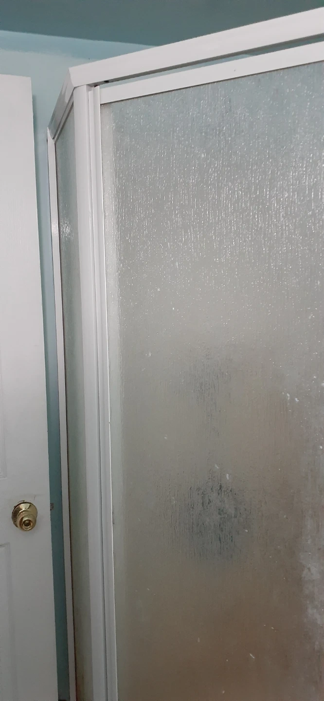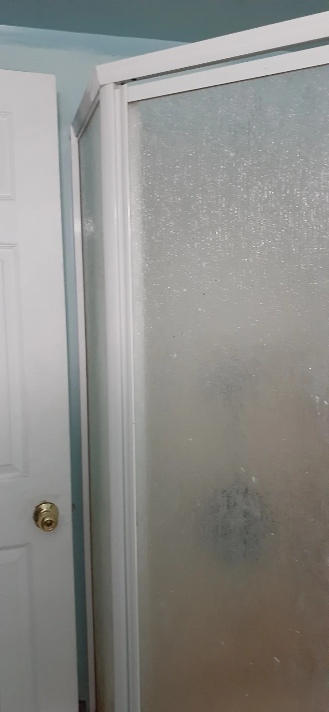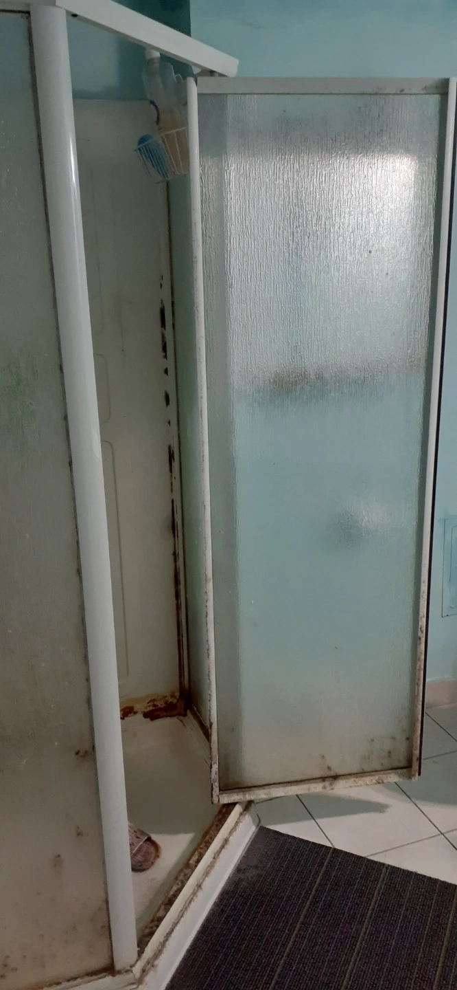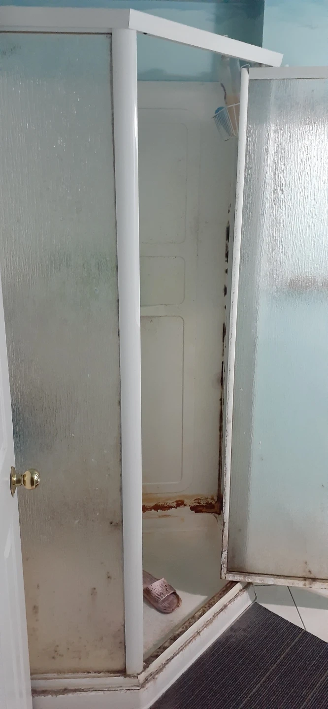 This is a corner shower stall with open/close glass doors. It has a white base and frame. It is in used condition.