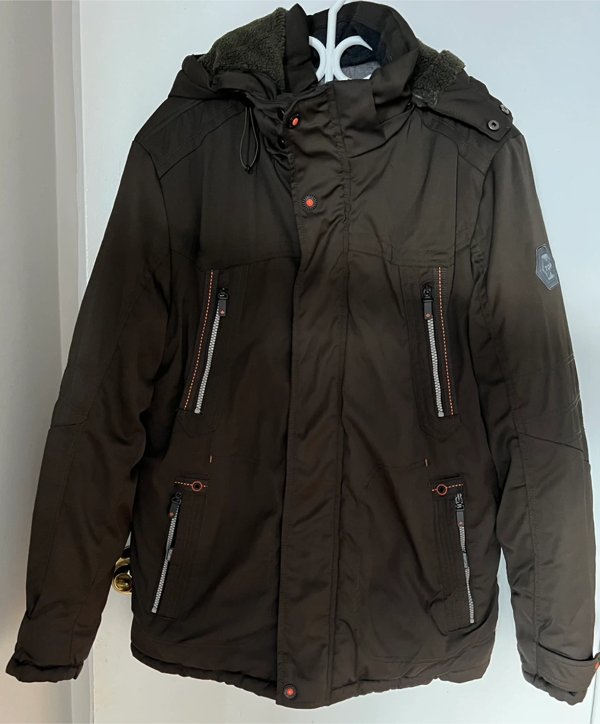 This men's parka is a warm, brown winter jacket. It features a sherpa-lined hood and multiple zippered pockets for practicality. A great option for staying cozy during colder weather!