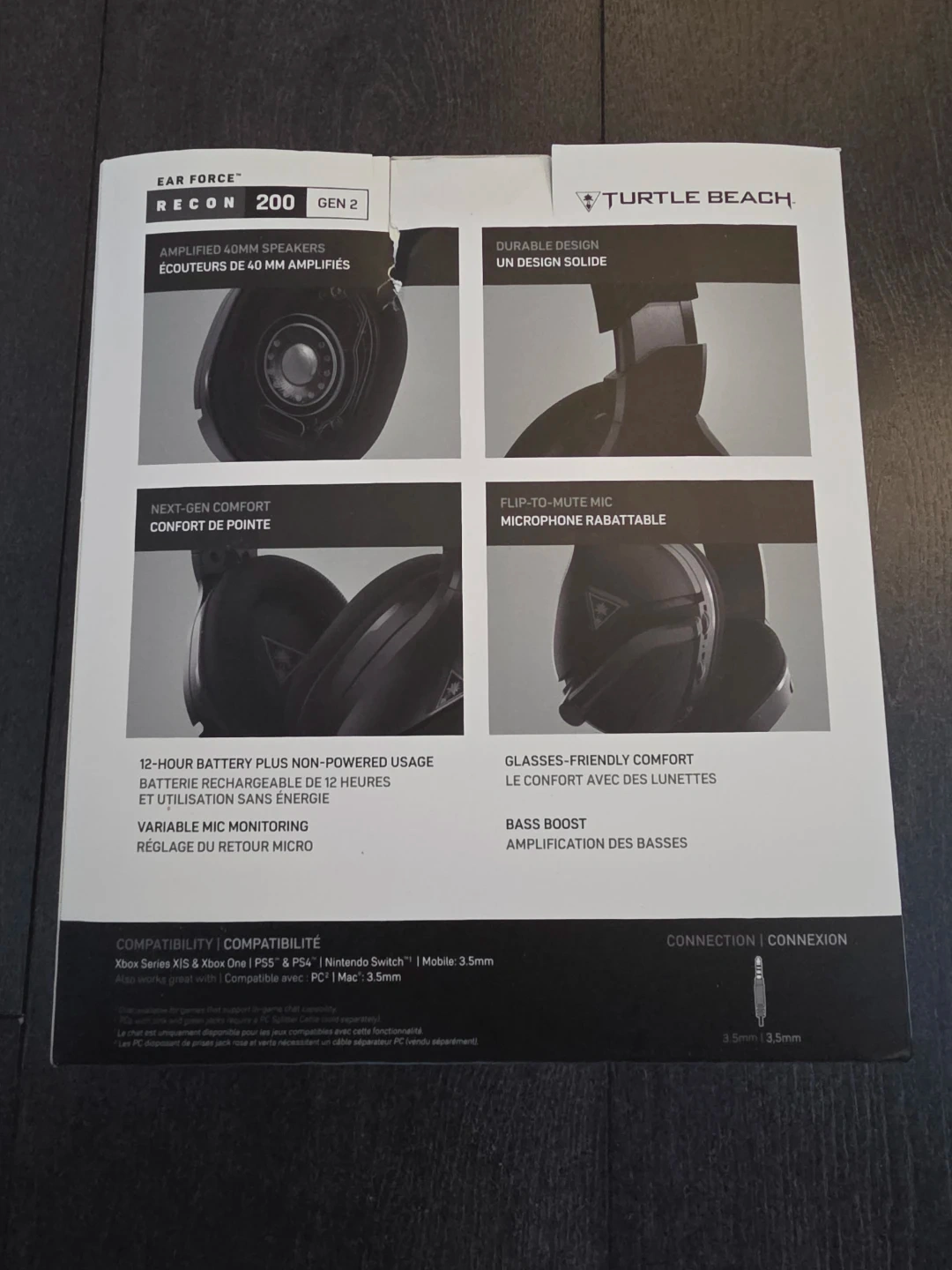 This is the Turtle Beach Recon 200 Gen 2 wired gaming headset. It features amplified 40mm speakers and a flip-to-mute mic. It offers 12-hour battery life and variable mic monitoring. It's compatible with Xbox, PlayStation, Switch, and PC.