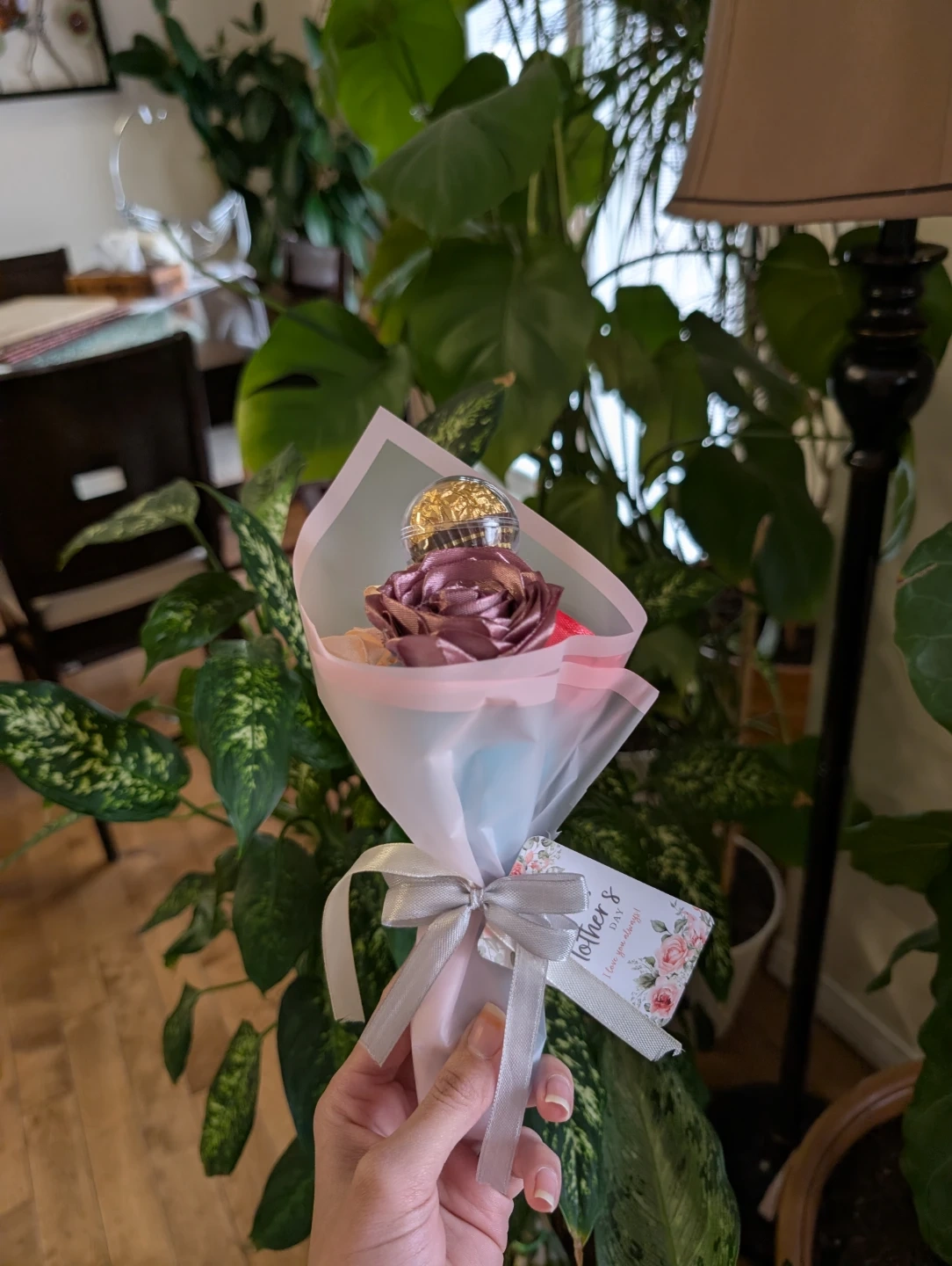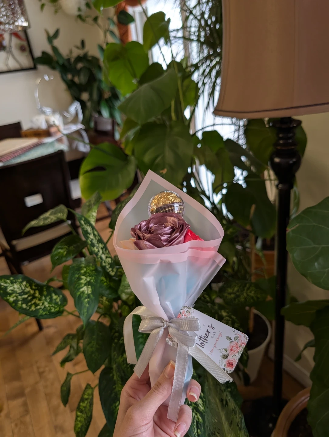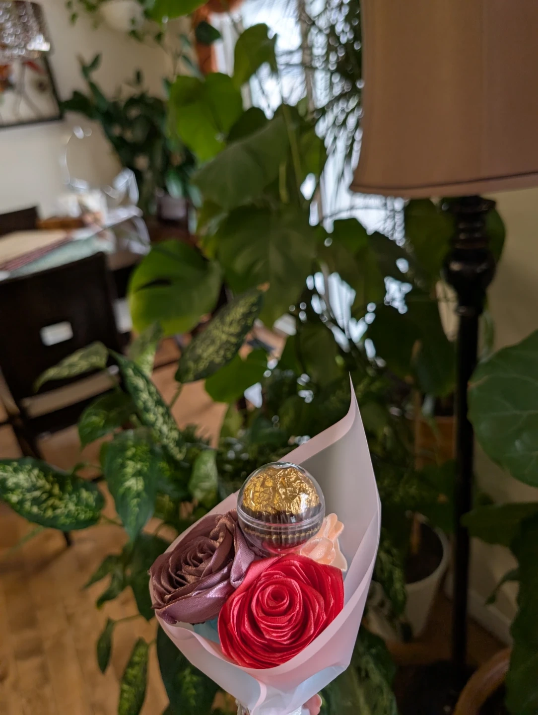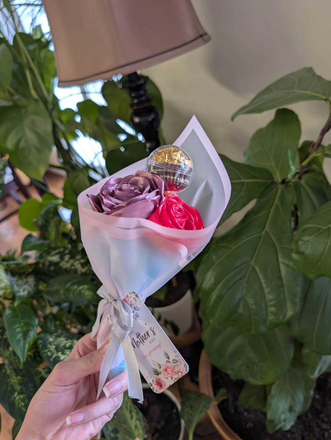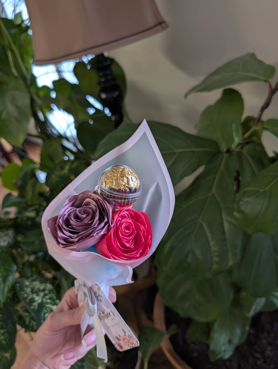 A sweet bouquet featuring faux roses and a Ferrero Rocher chocolate. It's wrapped in decorative paper with a ribbon. Perfect for a small gift or token of appreciation!