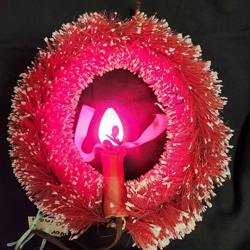 It has the red ribbon and a couple of holly berries attached and is in great working condition with its original red flame bulb.