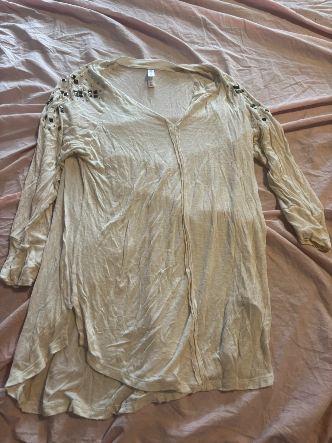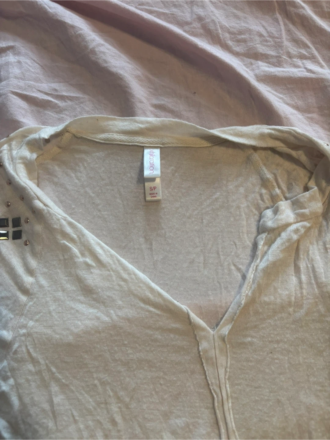 Selling a cute Xhilaration top in size small. It's a cream colour and has some embellishments on the shoulders. It's in great condition and ready for a new owner!