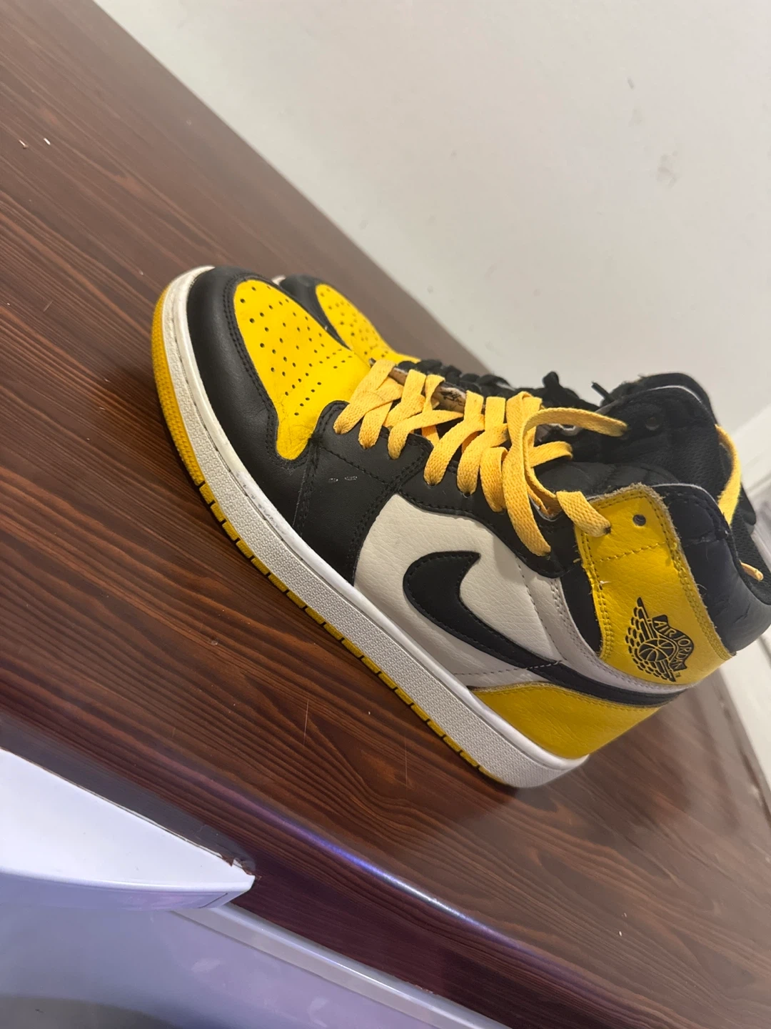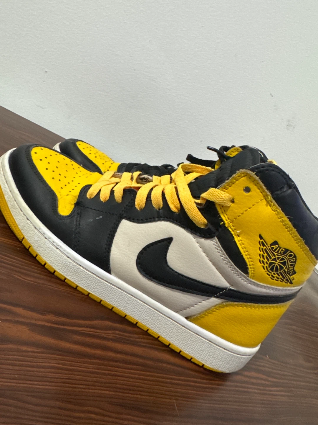 These are the Air Jordan 1 High OG "Pollen" sneakers. They feature a black, pollen yellow, and white colourway. They're constructed with leather uppers and rubber soles. These kicks are great for adding some vibrant style to your everyday look!