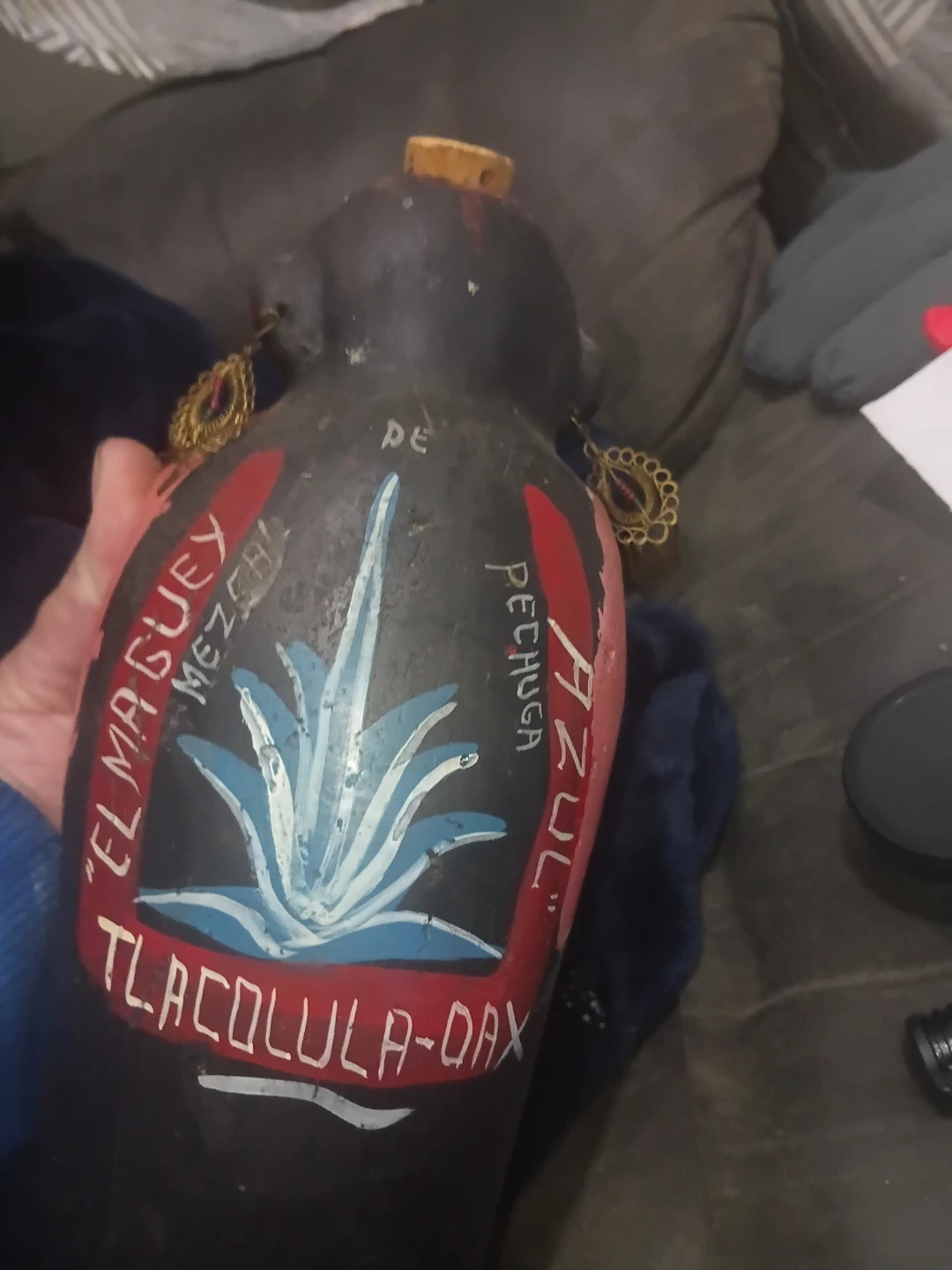 This is a decorative, hand-painted mezcal bottle from Tlacolula, Oaxaca. It features a stylized agave plant design and a cork stopper. The bottle has a unique, folk art appearance.