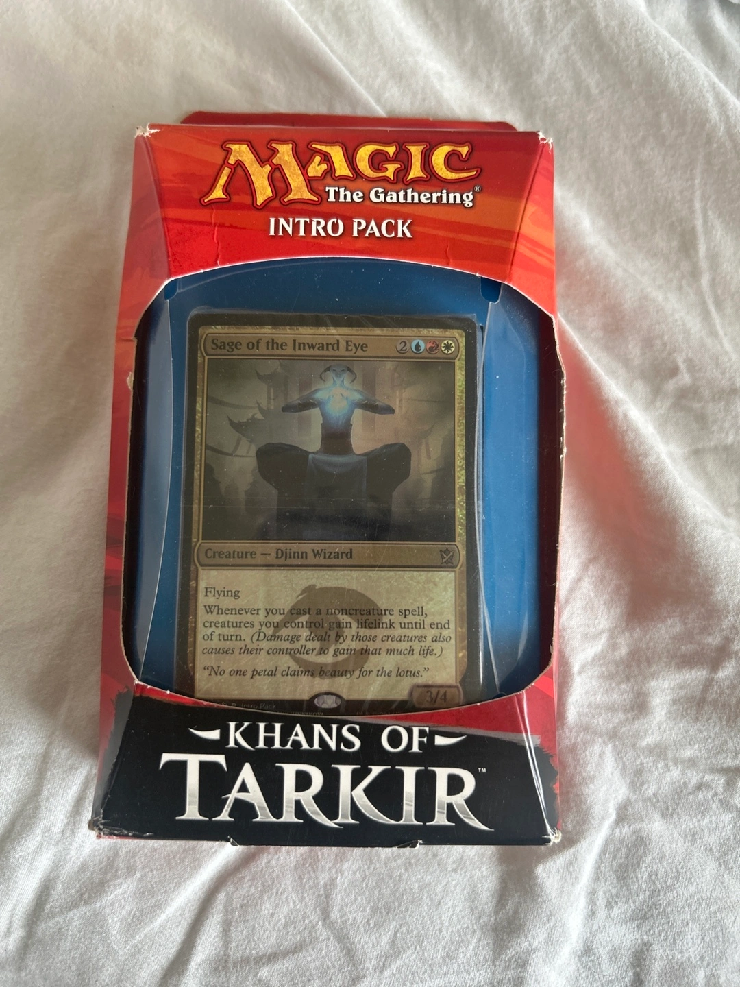 Selling a Magic The Gathering Intro Pack from the Khans of Tarkir series. It's a ready-to-play 60-card deck featuring a foil premium Sage of the Inward Eye, two Khans of Tarkir 15-card booster packs, a deck strategy insert, and a rules reference card. Perfect for getting into the game or expanding your collection!
