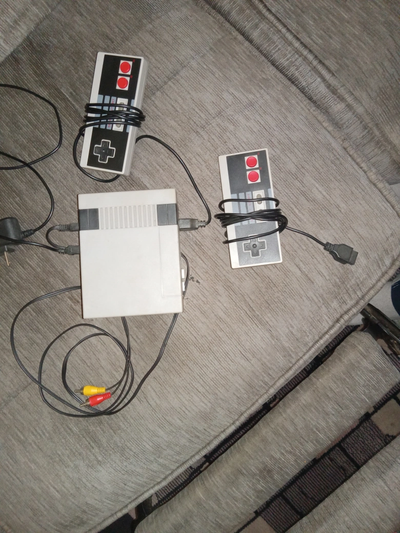 Miniature NES-style console. Includes two wired controllers. Power adapter and AV cables included. Great for retro gaming. 520 games