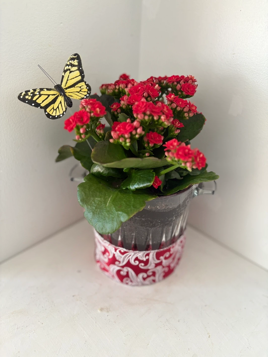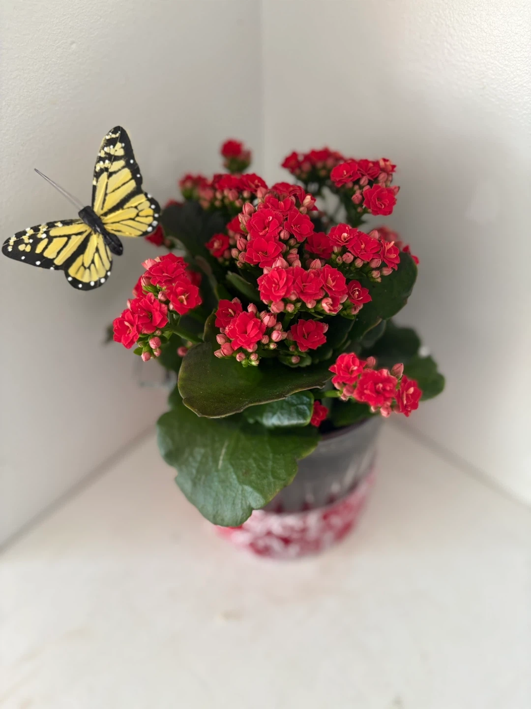 Bright red kalanchoe plant blooming in a clear, decorative glass pot. It's a lovely splash of colour for any indoor space. This plant thrives in bright light and is easy to care for.
