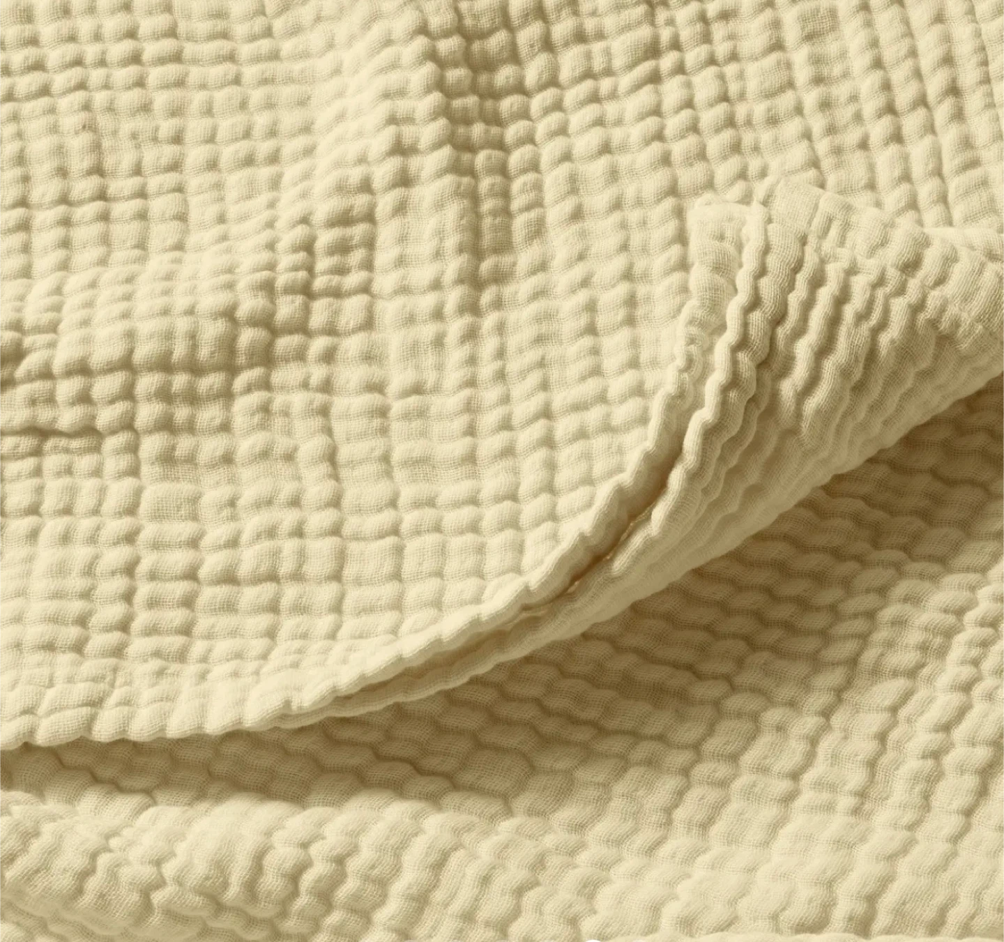 This brand new Buttercream muslin blanket has a crinkled texture. It's made of breathable cotton fabric. It's a great addition for adding an extra layer of coziness to your bed.