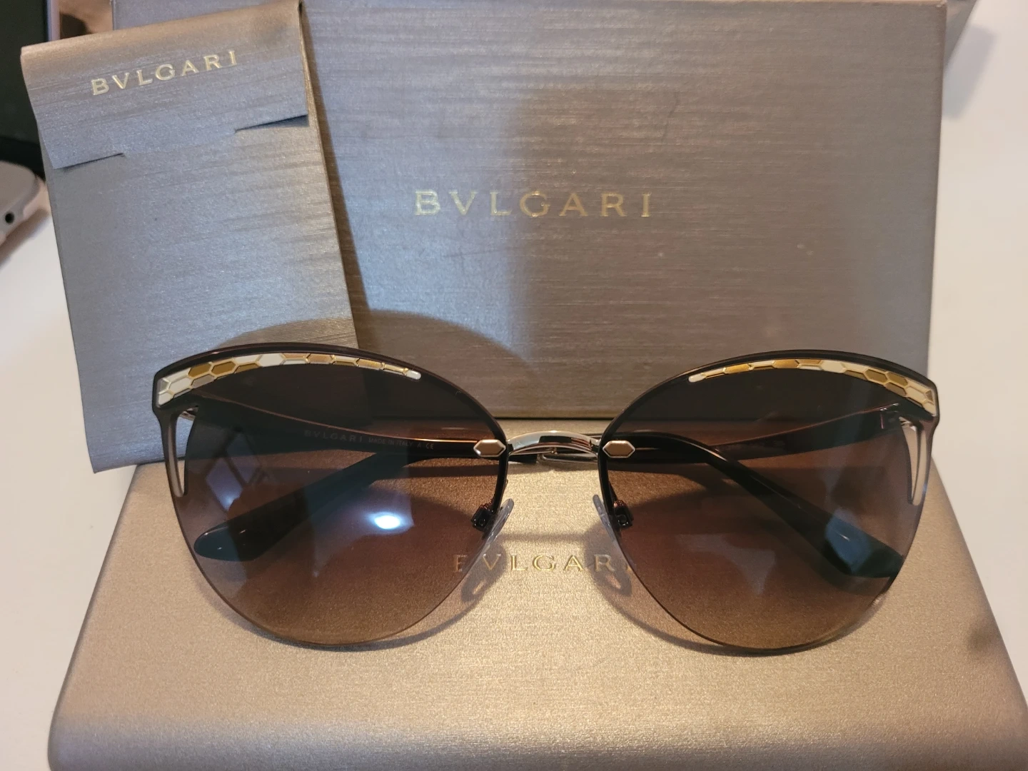 Authentic BVLGARI sunglasses. This is model BV6110. It has a chic cat-eye shape with brown gradient lenses. Gold-toned temples feature a cool hexagonal design. Comes with the original case. Never worn. Open to reasonable offers.