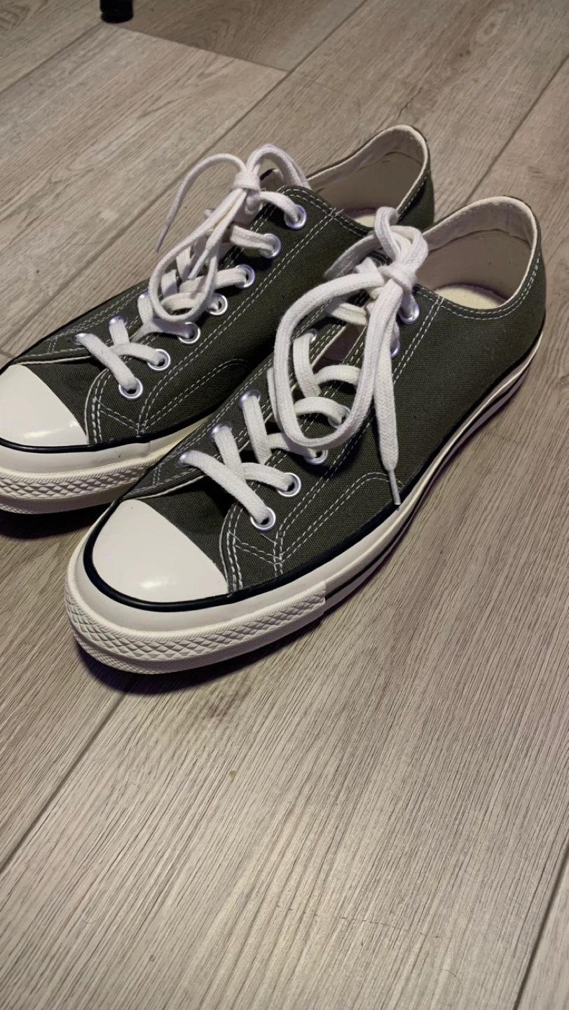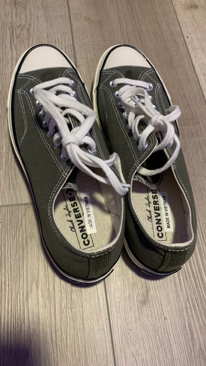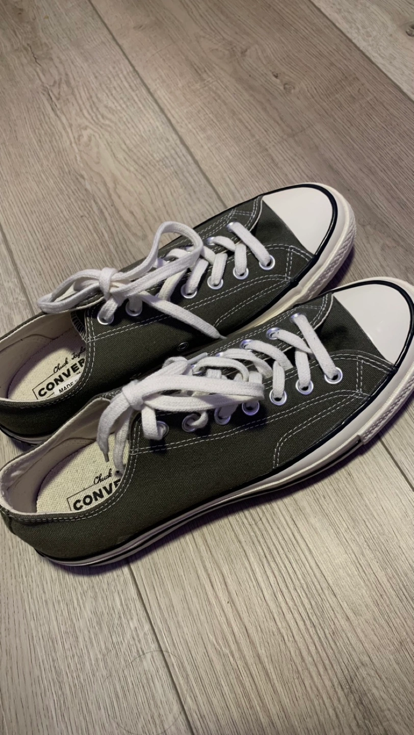 Pair of brand new, never worn, olive green low-top Converse Chuck Taylor All Star sneakers. Classic design, canvas upper. Made in Vietnam.
