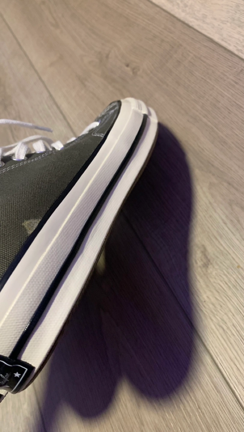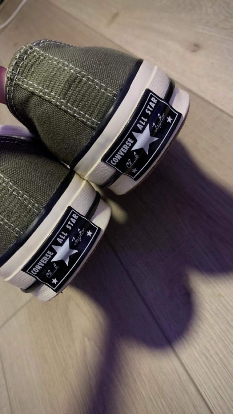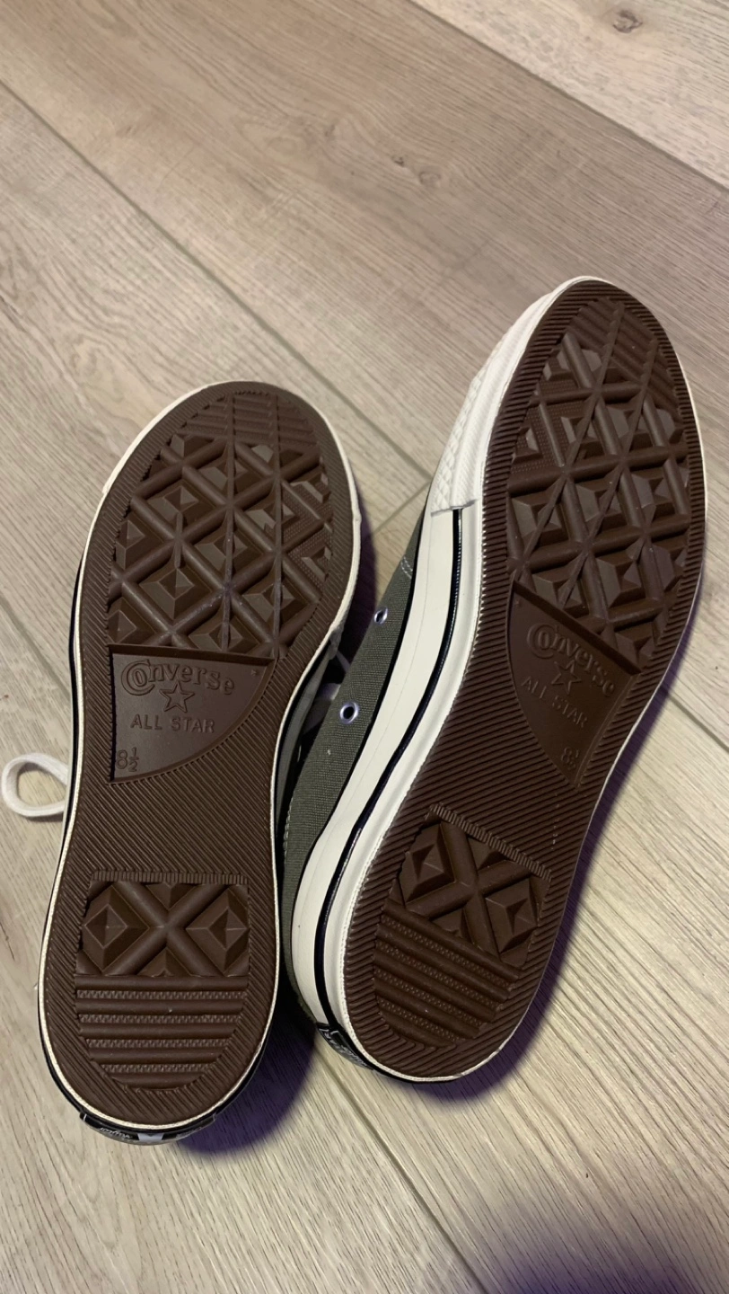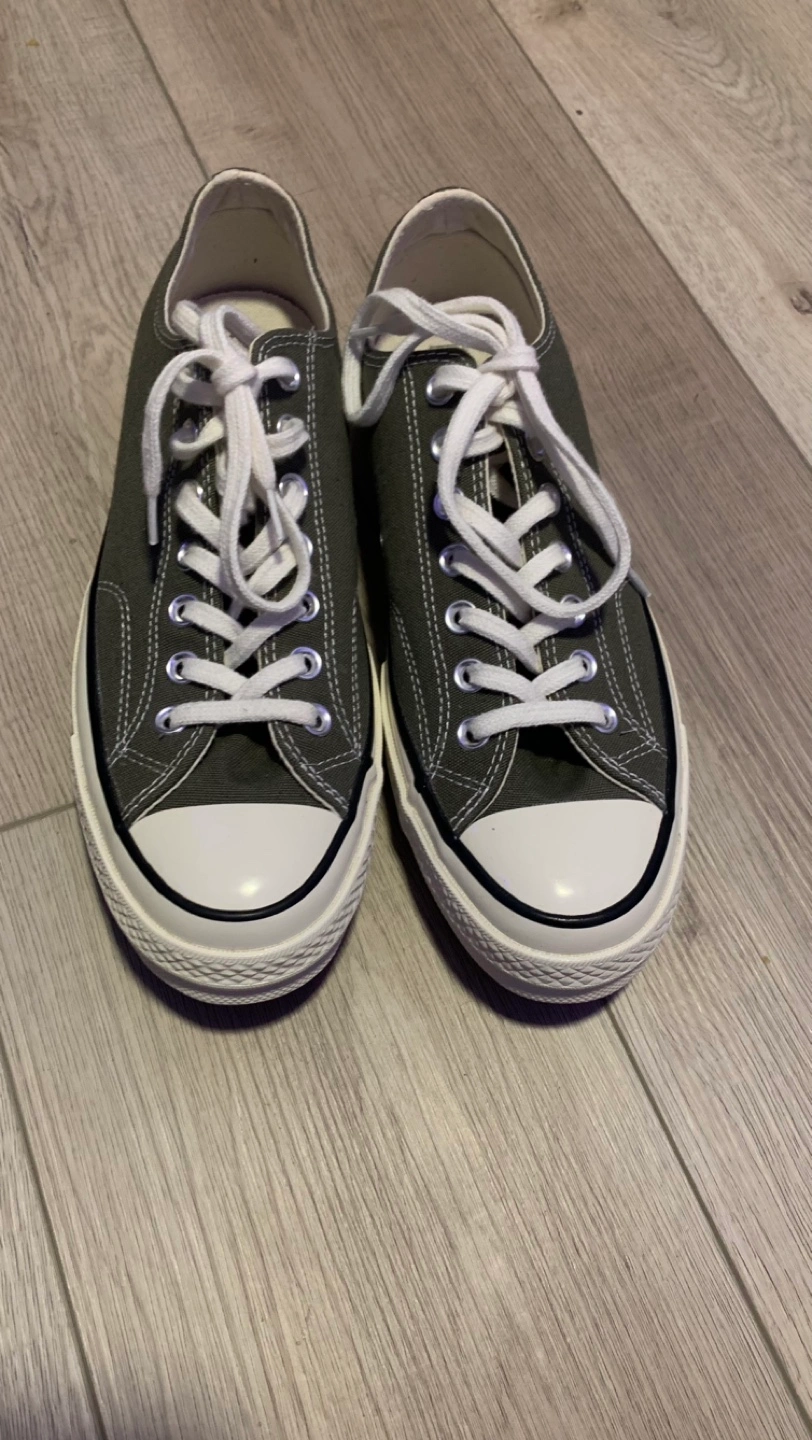 Pair of brand new, never worn, olive green low-top Converse Chuck Taylor All Star sneakers. Classic design, canvas upper. Made in Vietnam.