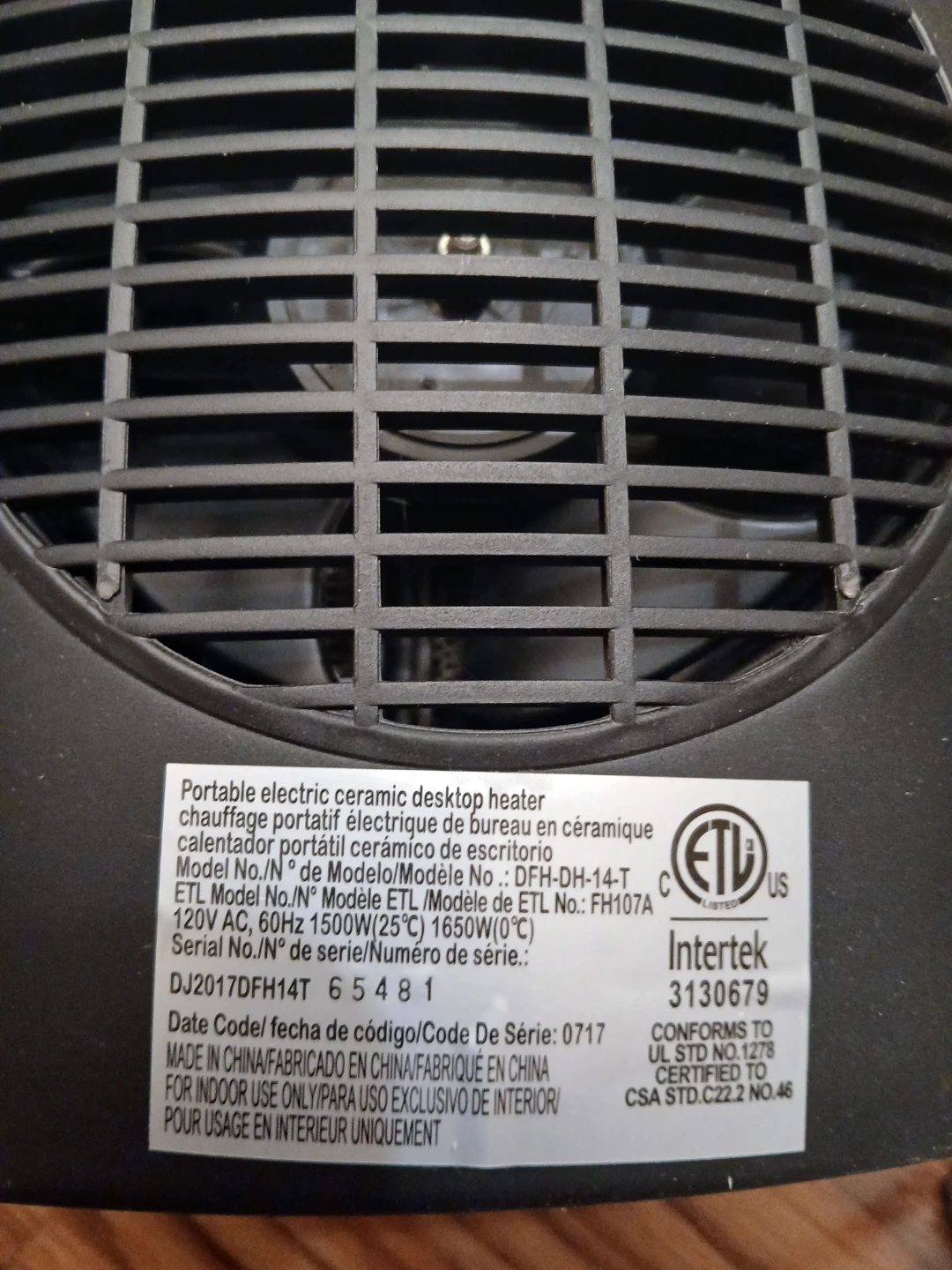 This Duraflame portable ceramic heater is great for small spaces. It's a 120V AC, 1500W model. It features two adjustable knobs for temperature and fan speed control.