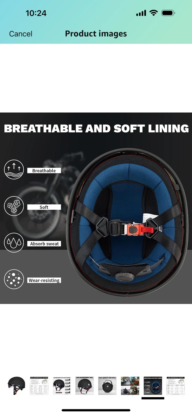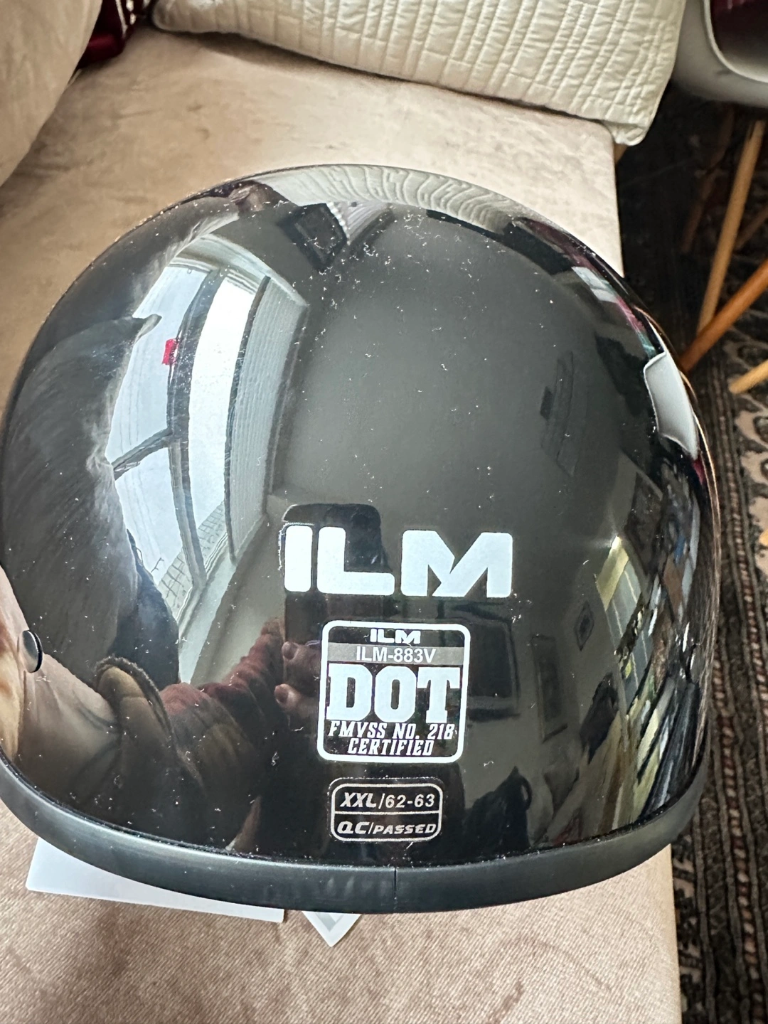Black half helmet. DOT certified. Size XXL (62-63cm). Features a breathable and soft lining. Includes chin strap and adjustment.