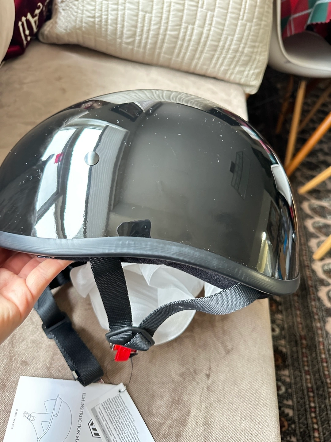 Black half helmet. DOT certified. Size XXL (62-63cm). Features a breathable and soft lining. Includes chin strap and adjustment.