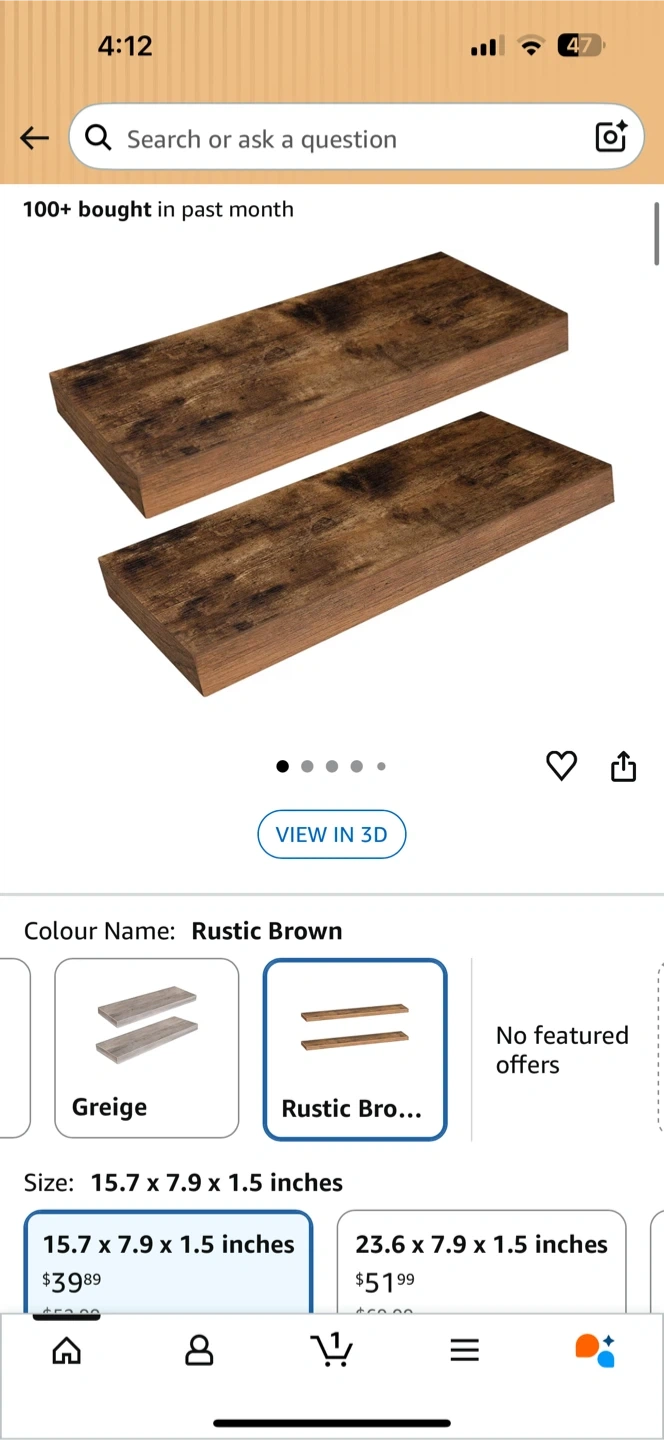 These are rustic brown floating shelves. Dimensions are 15.7 x 7.9 x 1.5 inches. They're great for displaying decor.