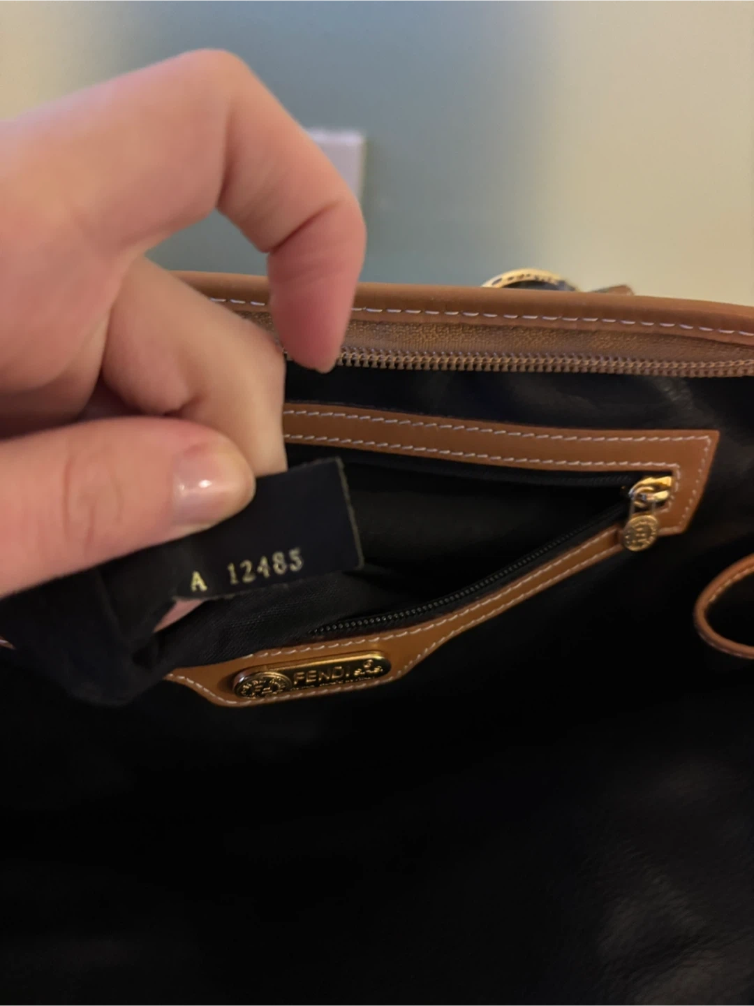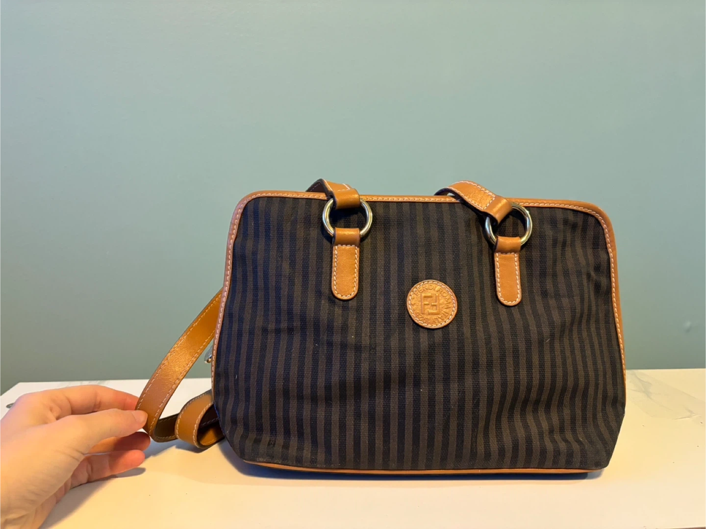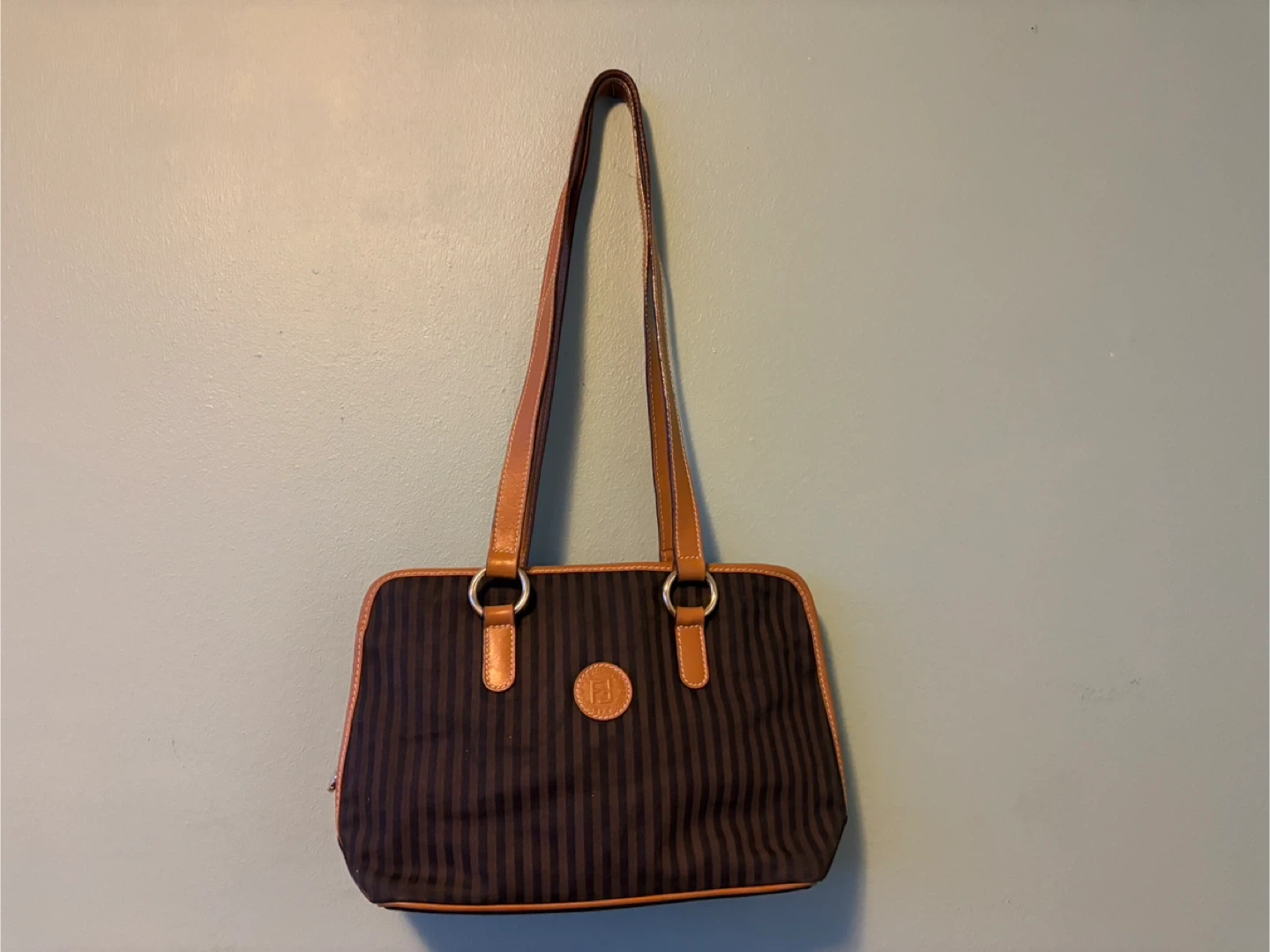A stylish Fendi shoulder bag with dark brown vertical stripes and tan leather trim. It has a zip-top closure and comfortable shoulder straps. Interior features a zippered pocket.