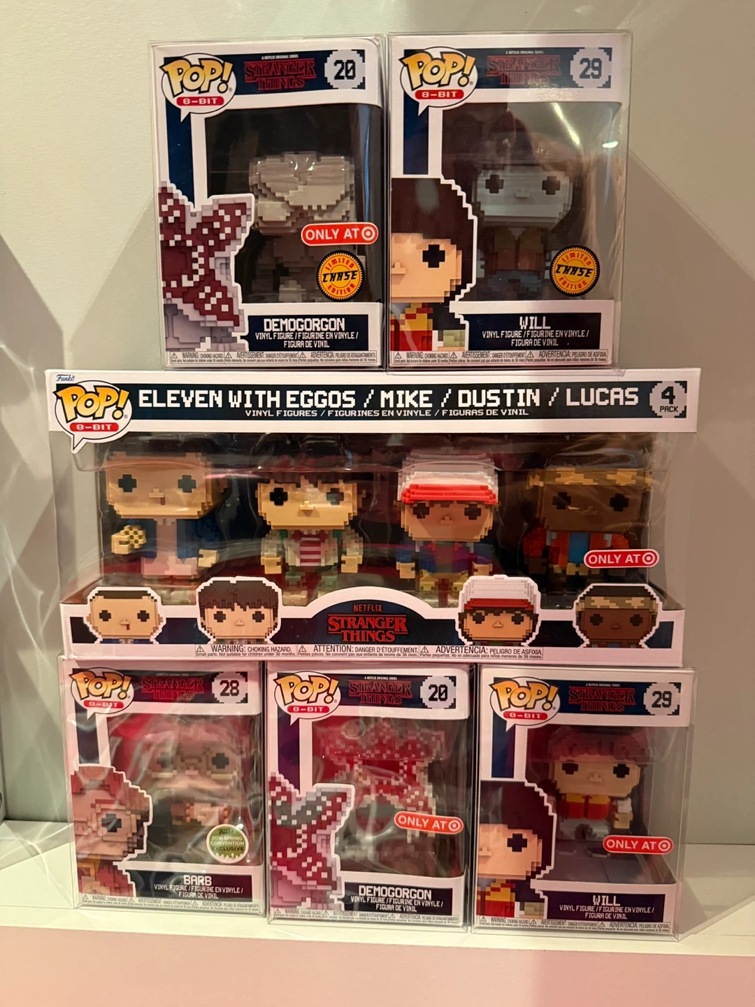 Selling a collection of Funko Pop! 8-Bit Stranger Things vinyl figures! Includes Demogorgon, Will, Eleven with Eggos/Mike/Dustin/Lucas (4-pack), and Barb. All are in their original boxes and great condition. Perfect for any Stranger Things fan!