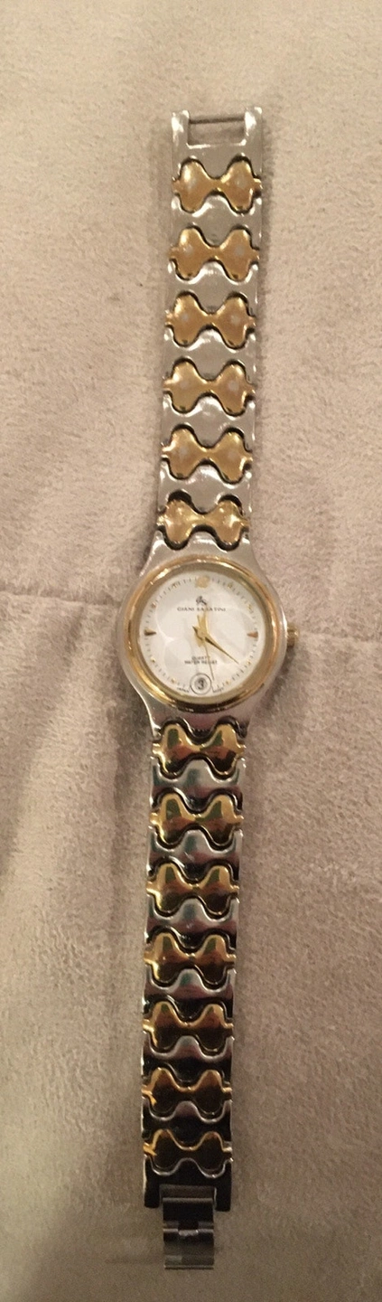 This ladies watch features a two-tone gold and silver band, making it a stylish accessory for any outfit. The watch is in good condition, showing only gentle wear. Needs a new battery. Let me know if you're interested!