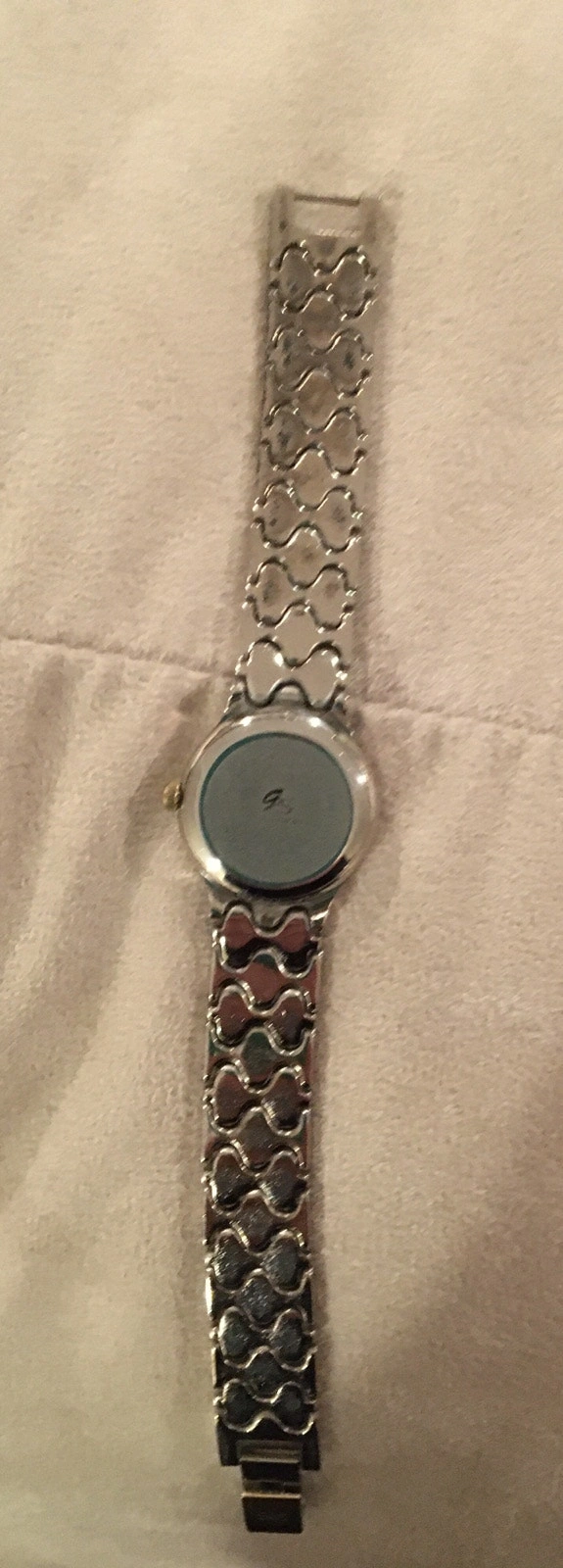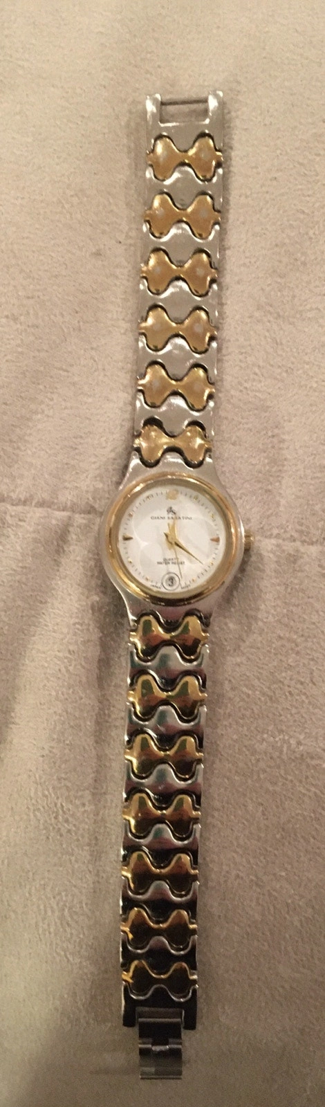 This ladies watch features a two-tone gold and silver band, making it a stylish accessory for any outfit. The watch is in good condition, showing only gentle wear. Needs a new battery. Let me know if you're interested!