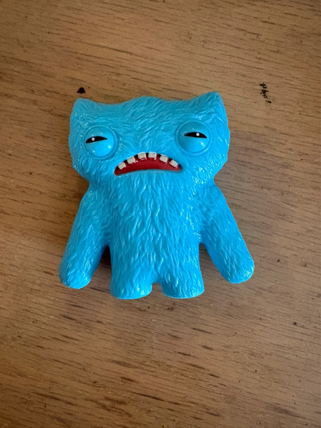 Bright blue plush-style toy with a funny face and big eyes. It's got a distinctive furry texture and a grumpy expression. This toy is perfect for collectors of quirky characters or as a fun desk accessory.