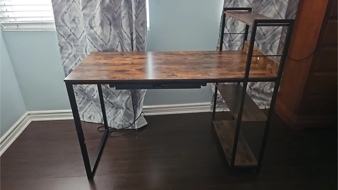 Here's a computer desk that's in great shape! It features a rustic brown finish and convenient shelving on the side. Perfect for a home office or study space.