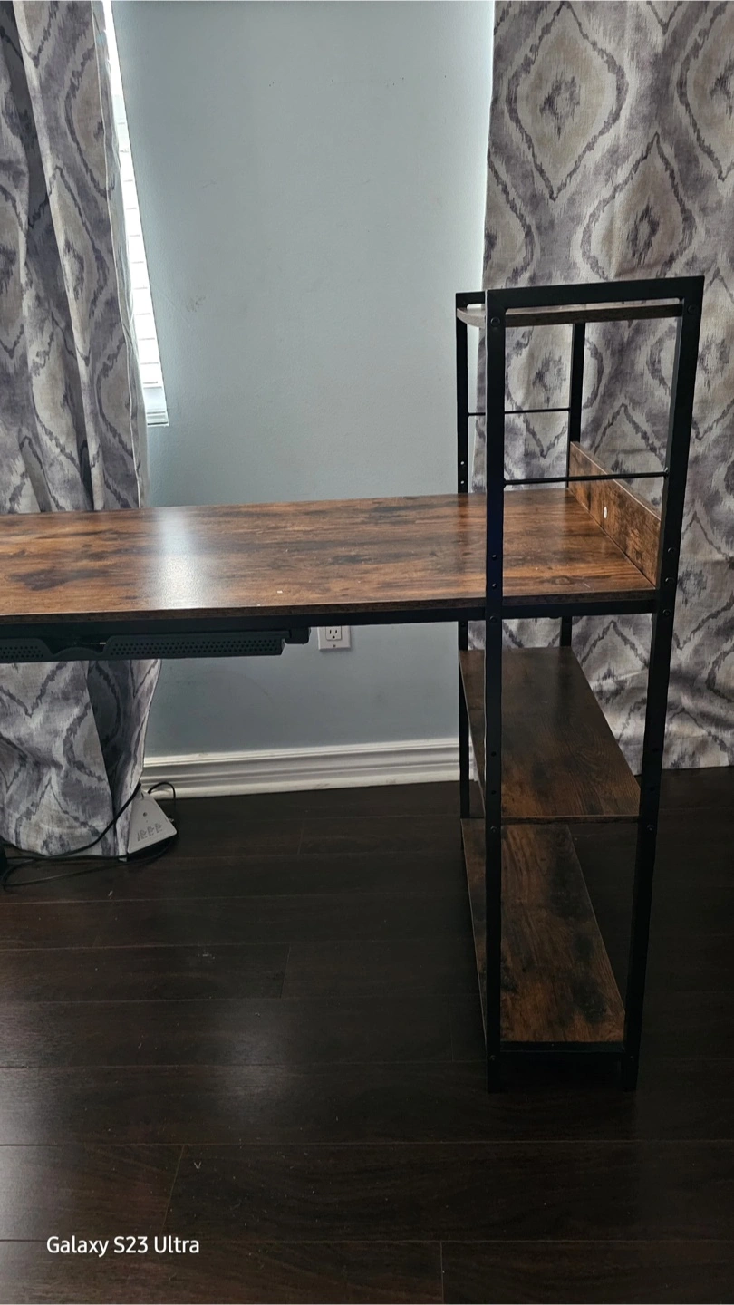 Here's a computer desk that's in great shape! It features a rustic brown finish and convenient shelving on the side. Perfect for a home office or study space.