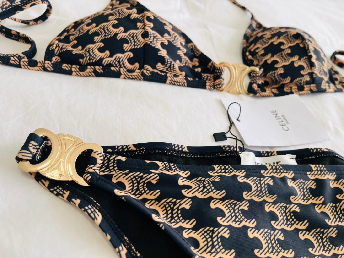 This is a Celine bikini set featuring the iconic Triomphe print in black and tan. It has gold-tone hardware at the centre of the bust and on the hips. It's a stylish choice for the beach or pool!