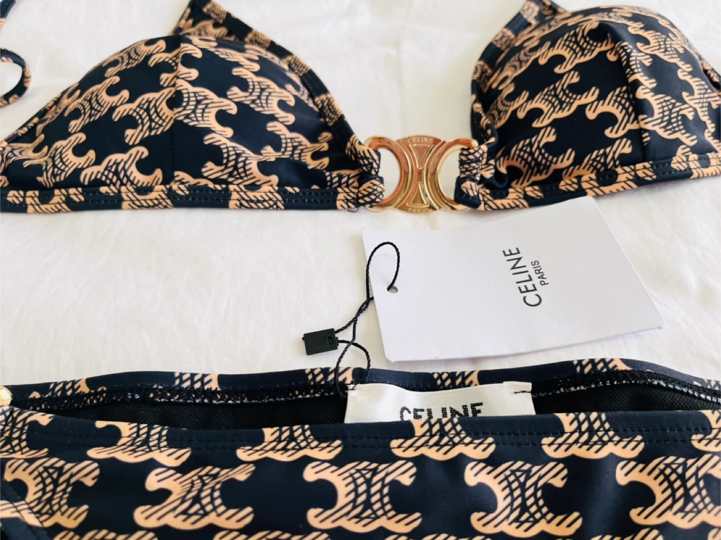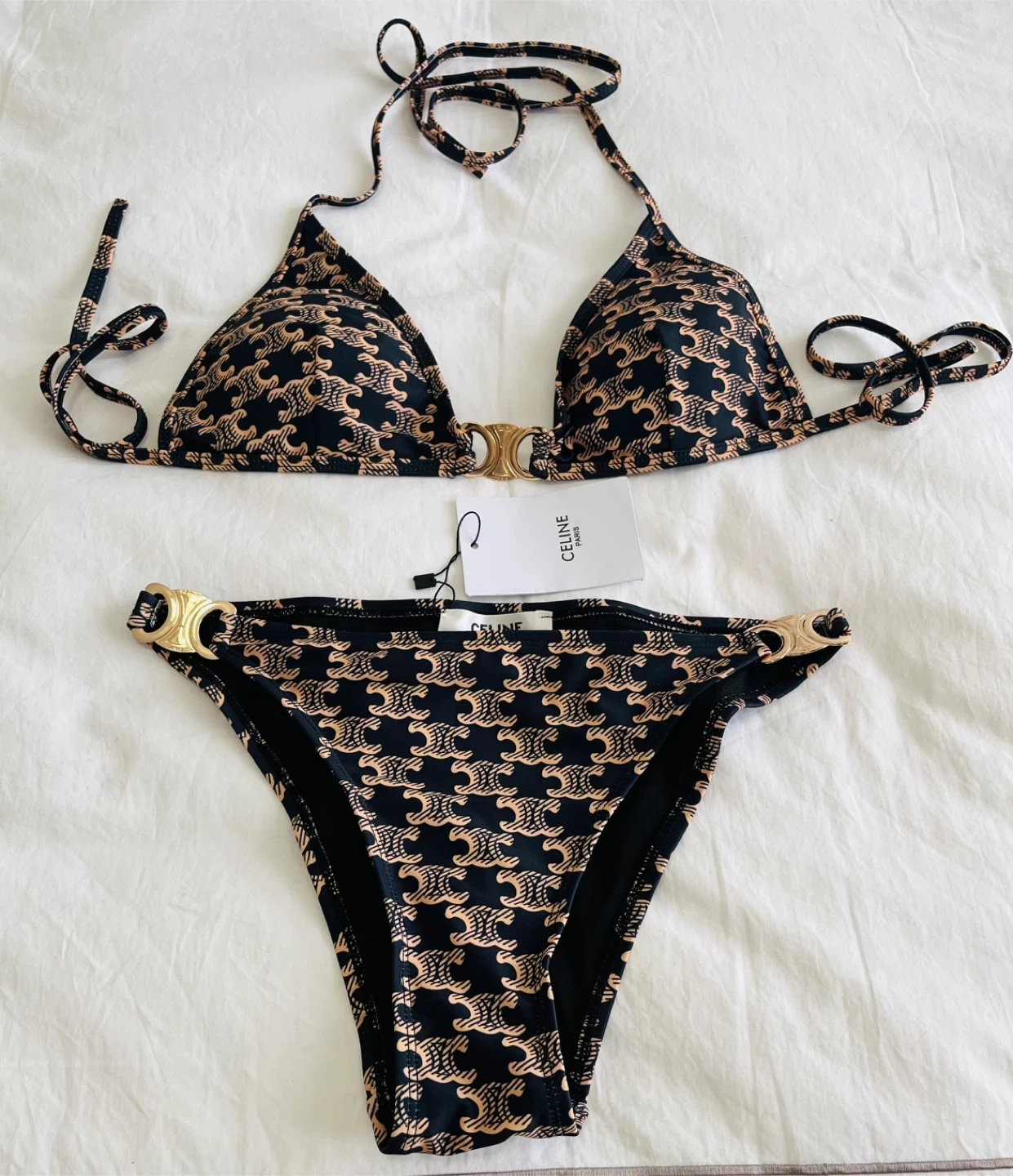 This is a Celine bikini set featuring the iconic Triomphe print in black and tan. It has gold-tone hardware at the centre of the bust and on the hips. It's a stylish choice for the beach or pool!