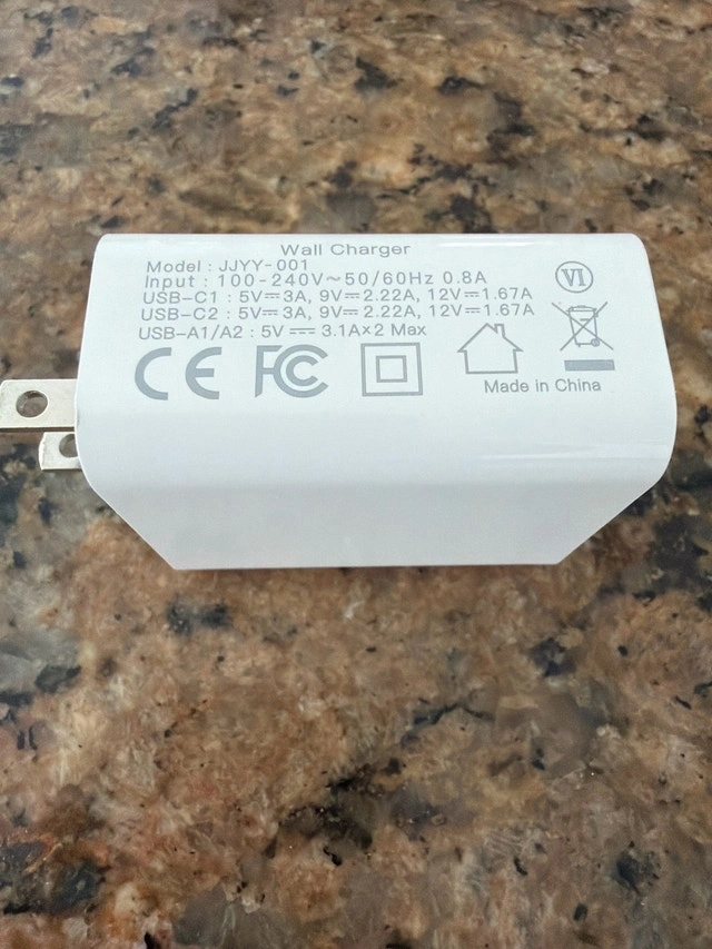This brand new power adapter for 4 devices offers fast charging for a variety of devices using both USB and USB-C connections, ensuring your gadgets power up quickly and efficiently. Perfect for anyone needing a reliable and speedy charging solution. Specifications: Model: JJYY-001 Input: 100-240V~50/60Hz 0.8A USB-C1: 5V=3A, 9V=2.22A, 12V=1.67A USB-C2: 5V=3A, 9V=2.22A, 12V=1.67A USB-A1/A2: 5V=3.1A x 2 Max If you're reading this, it's still available!