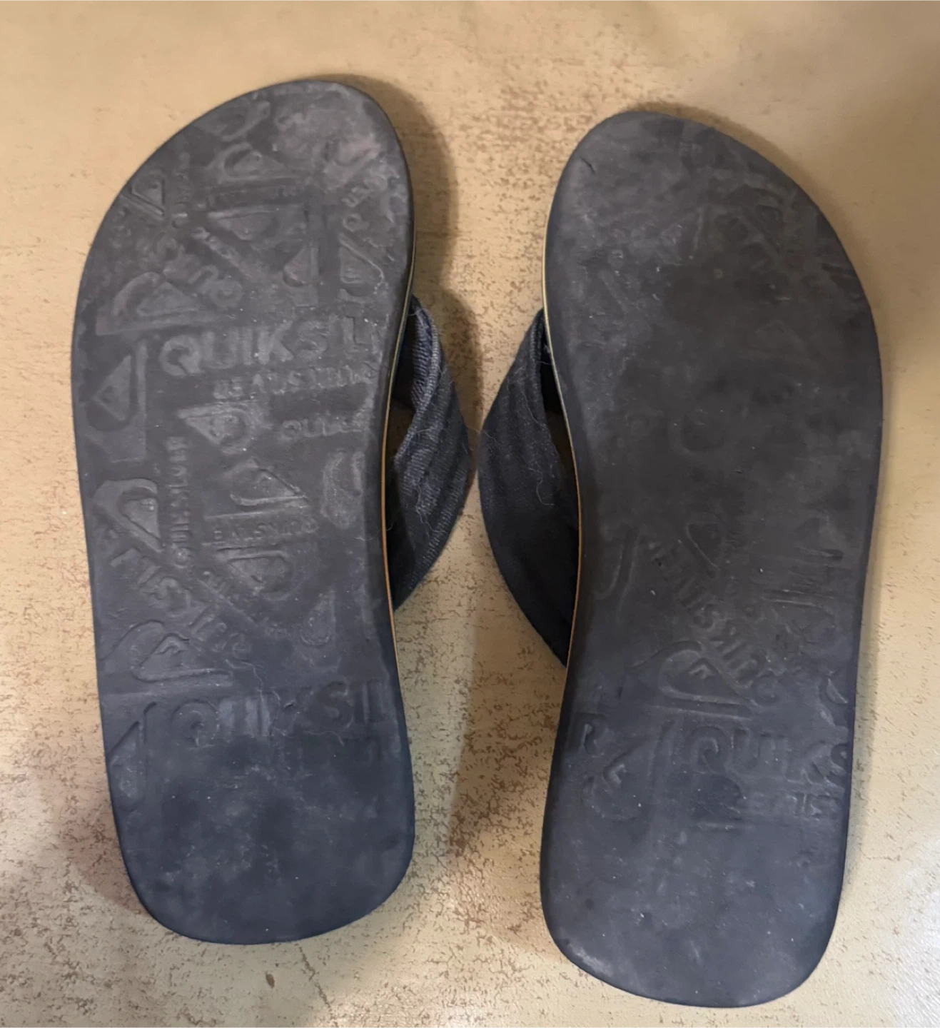 These Quiksilver flip flops are navy blue with orange and yellow accents. They have the Quiksilver logo on the straps and soles. Perfect for casual wear or beach days!