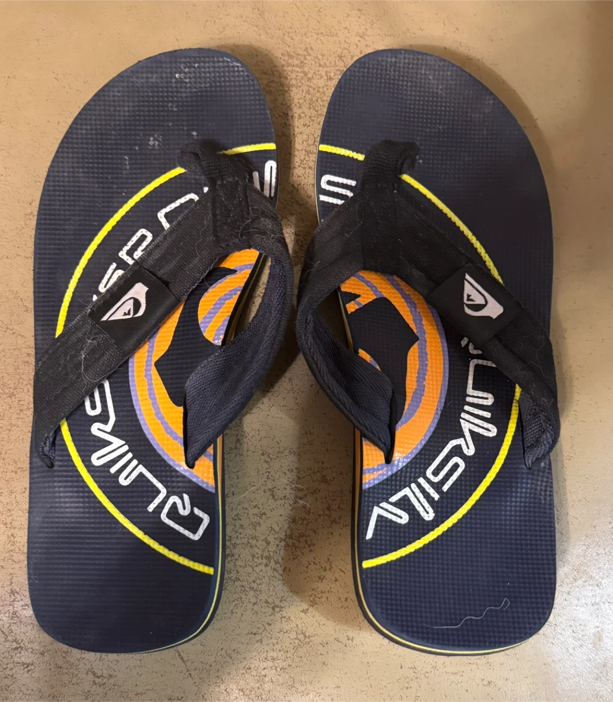 These Quiksilver flip flops are navy blue with orange and yellow accents. They have the Quiksilver logo on the straps and soles. Perfect for casual wear or beach days!