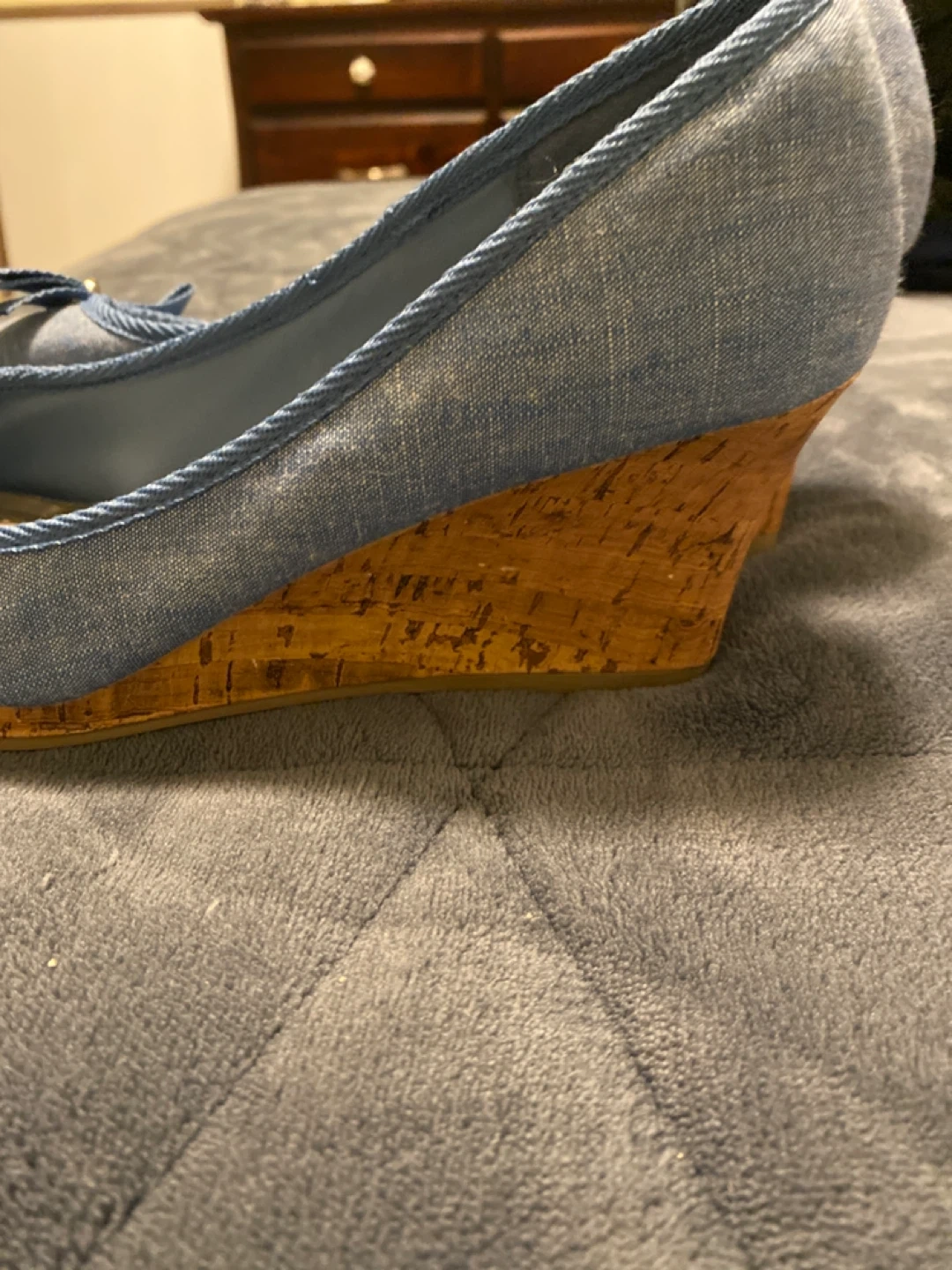 These cute peep-toe wedges are made with a blue denim-style fabric and a charming bow detail. They feature a comfortable cork wedge heel. Perfect for adding a touch of casual style to any outfit!