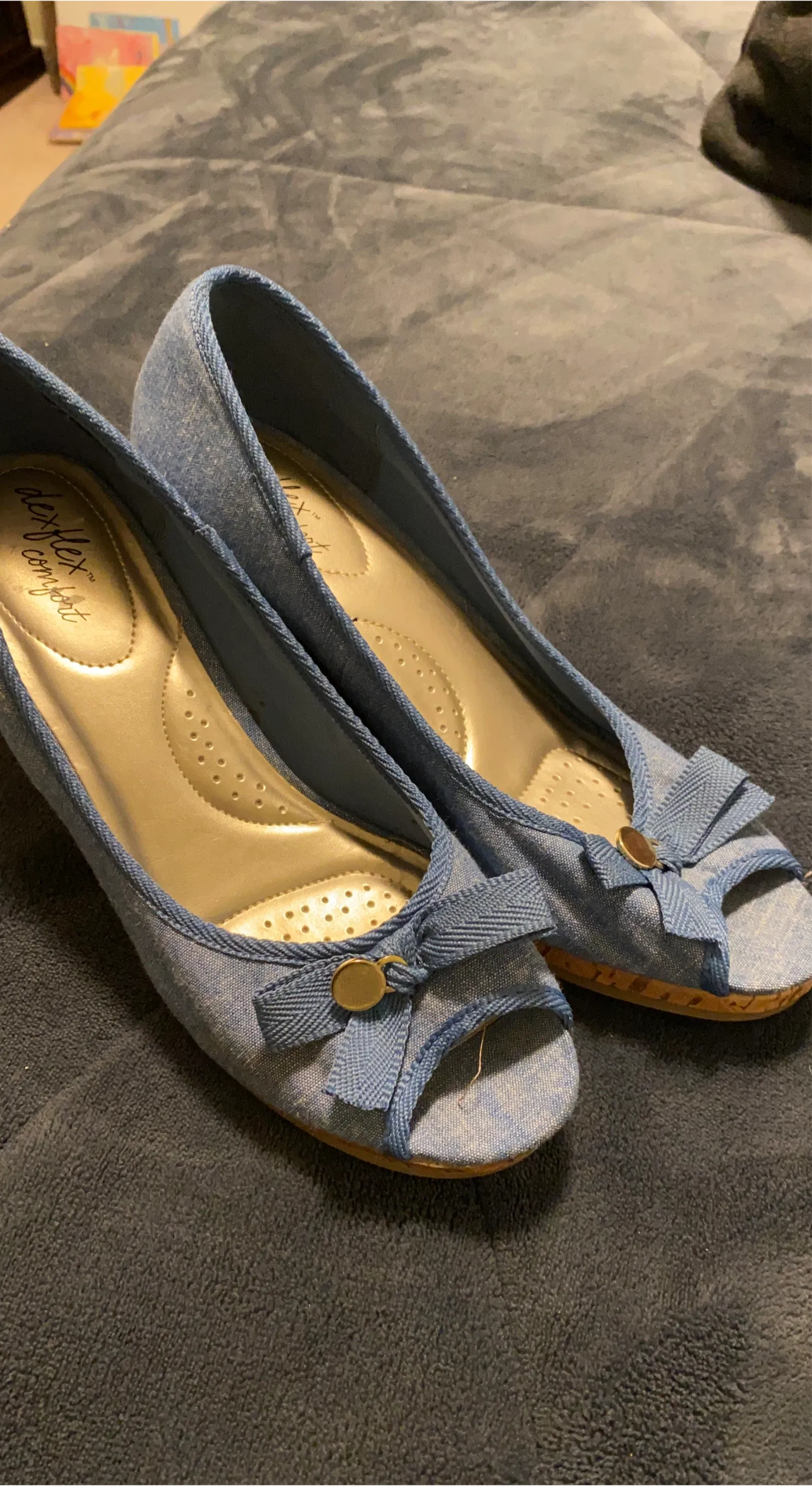 These cute peep-toe wedges are made with a blue denim-style fabric and a charming bow detail. They feature a comfortable cork wedge heel. Perfect for adding a touch of casual style to any outfit!