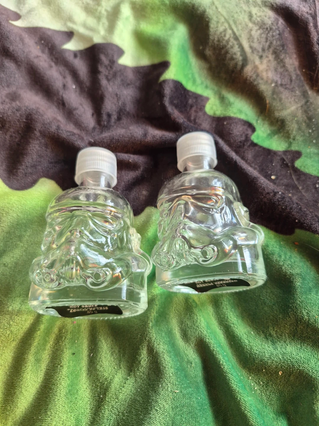 Two novelty glass bottles shaped like Stormtrooper helmets. Each bottle contains 45g of hot sauce. They're great for collectors or as a fun gift! (Washed)