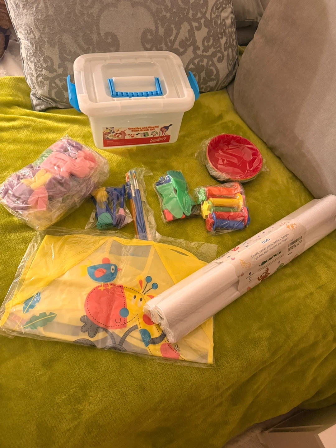 This set includes a carrying case, painting smock, paper roll, and various art supplies. It's designed for creative and playful art experiences. Use it with crayons, coloured pencils, markers, sponges, gel pens, paint, and even your fingers!