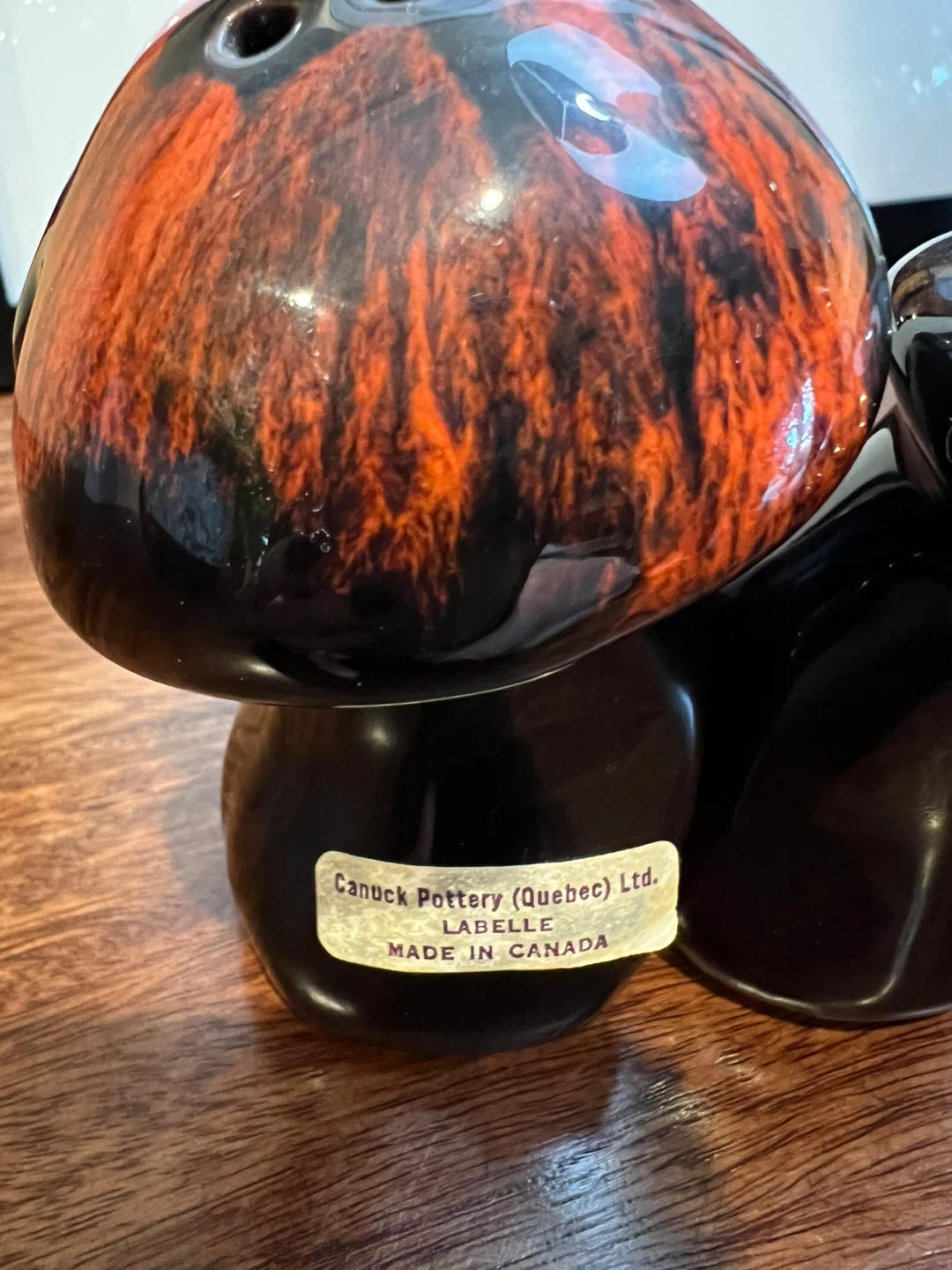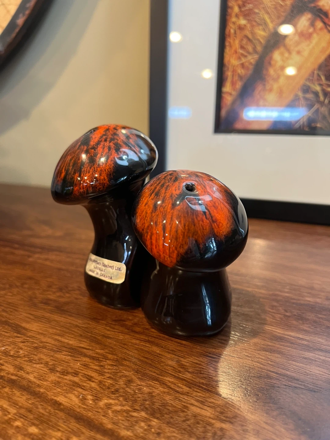 Cute nesting mushroom-shaped salt and pepper shakers from Canuck Pottery (Quebec) Ltd