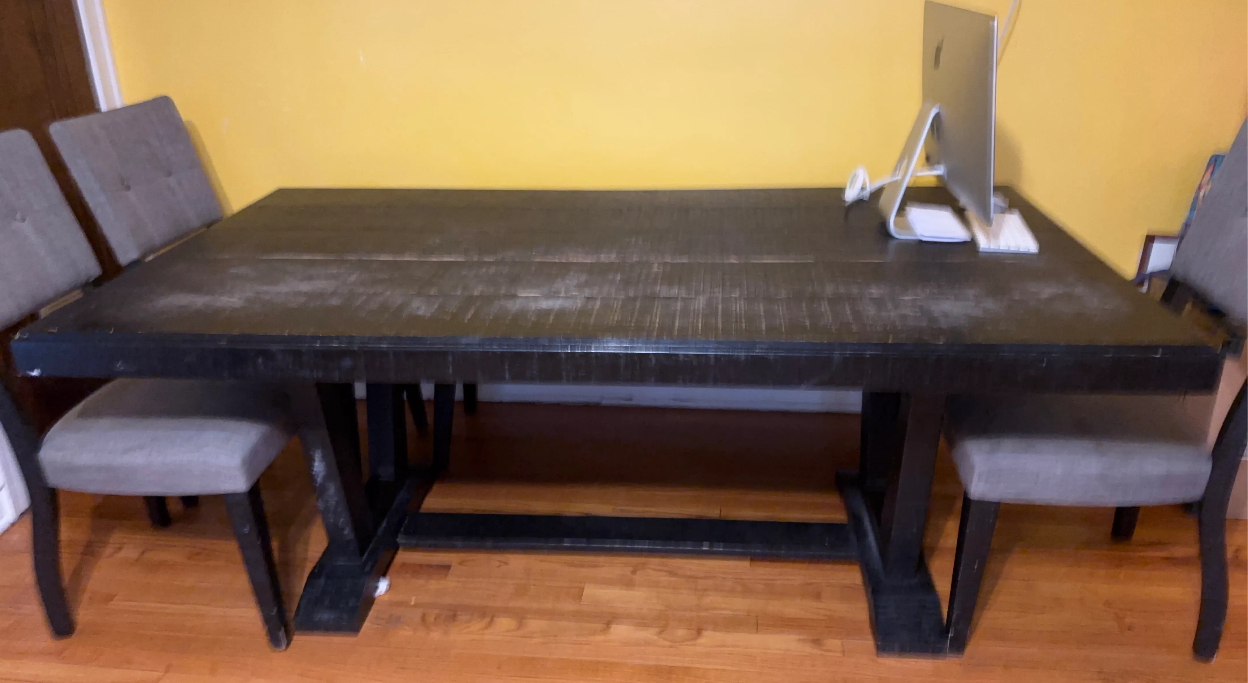 This is a dark wood dining table with a rustic finish. It's a sturdy piece perfect for family meals or gatherings. The table's dimensions are suitable for seating up to six people comfortably.