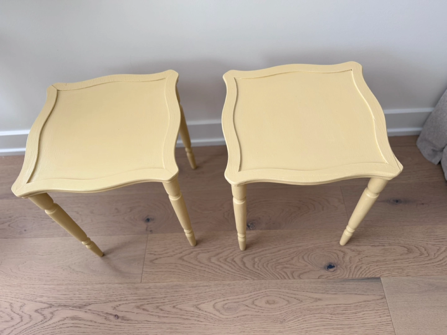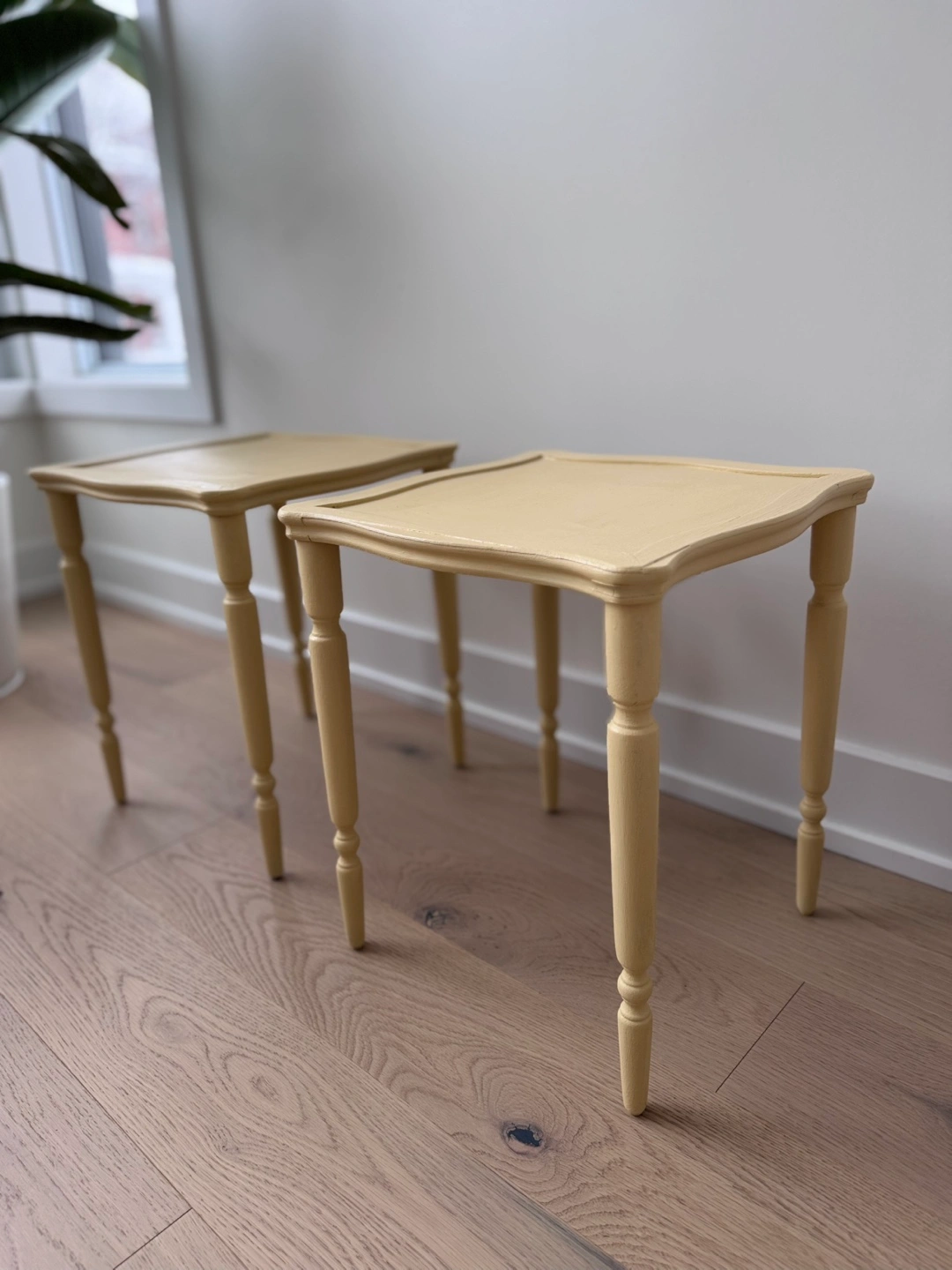 Lovely pair of vintage side tables. Pale yellow finish. Turned legs. Square tops with curved edges. Perfect for a living room or bedroom.