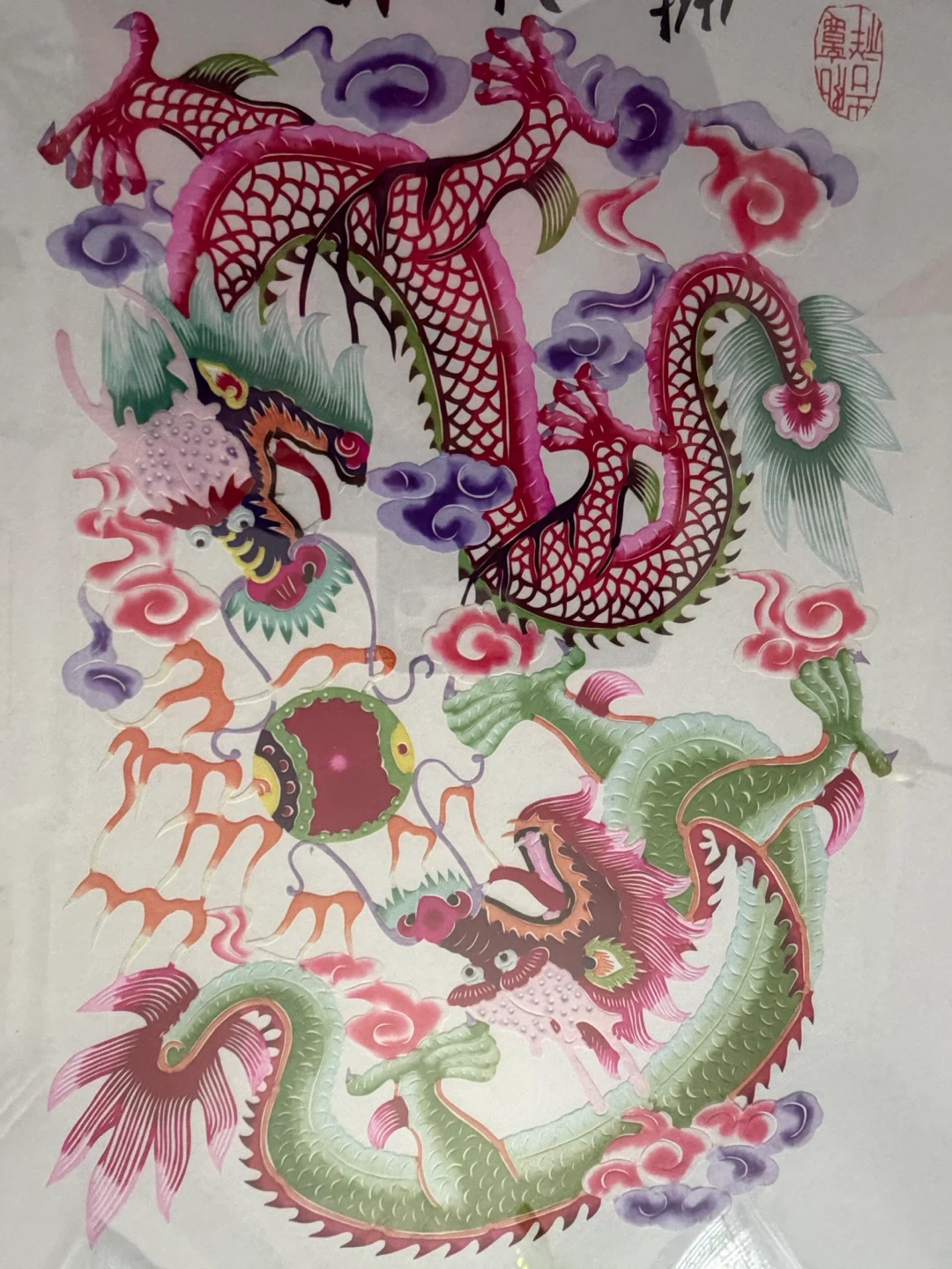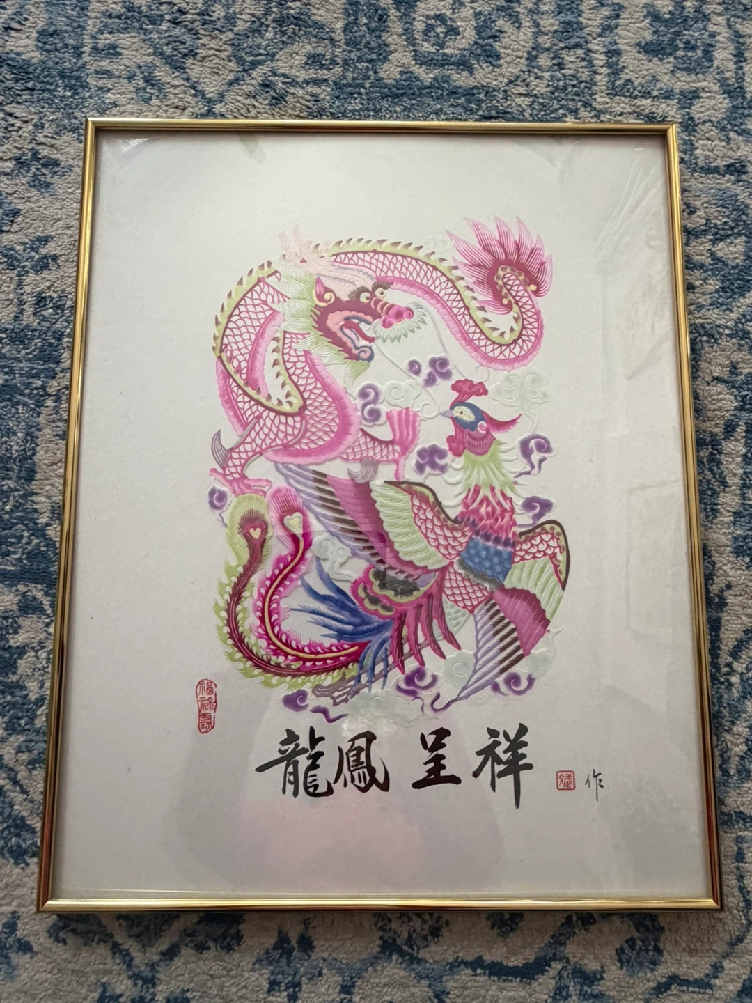 This set includes two framed Chinese paper cutouts, one with dragons and another with a dragon and phoenix design. The vibrant colors and intricate details make them a striking addition to any decor. They're perfect for adding a touch of cultural art to your home!