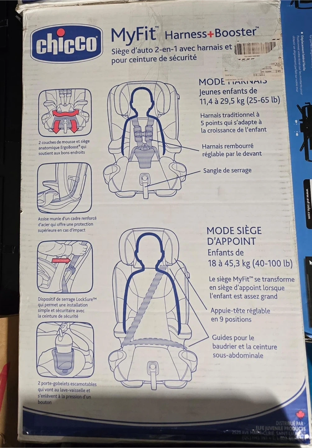 This Chicco MyFit harness booster car seat is designed for children from 11.4 to 45.3 kg (25-100 lb). It features a 5-point harness that adjusts with your child's growth and a padded seat for comfort. The headrest adjusts to 9 positions, and it includes two cup holders.