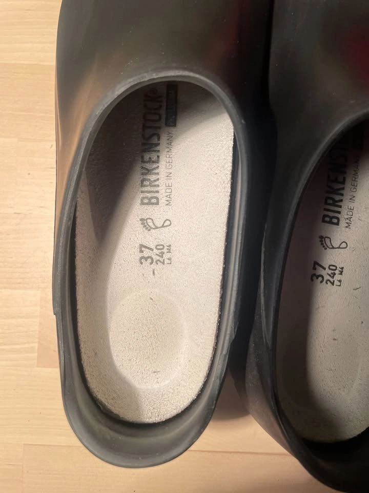 These Birkenstock A 630 PU clogs were only worn a few times. I found they fit a bit long for me, so I'd suggest they might be better for someone who wears a US 38 or a US 37 with thicker socks. I personally prefer a 235mm size since I don't wear thick socks. It's really best to try them on to see if they work for you!