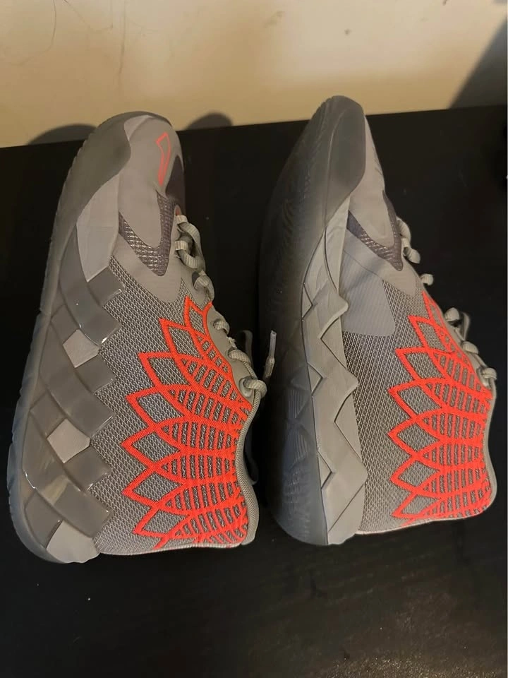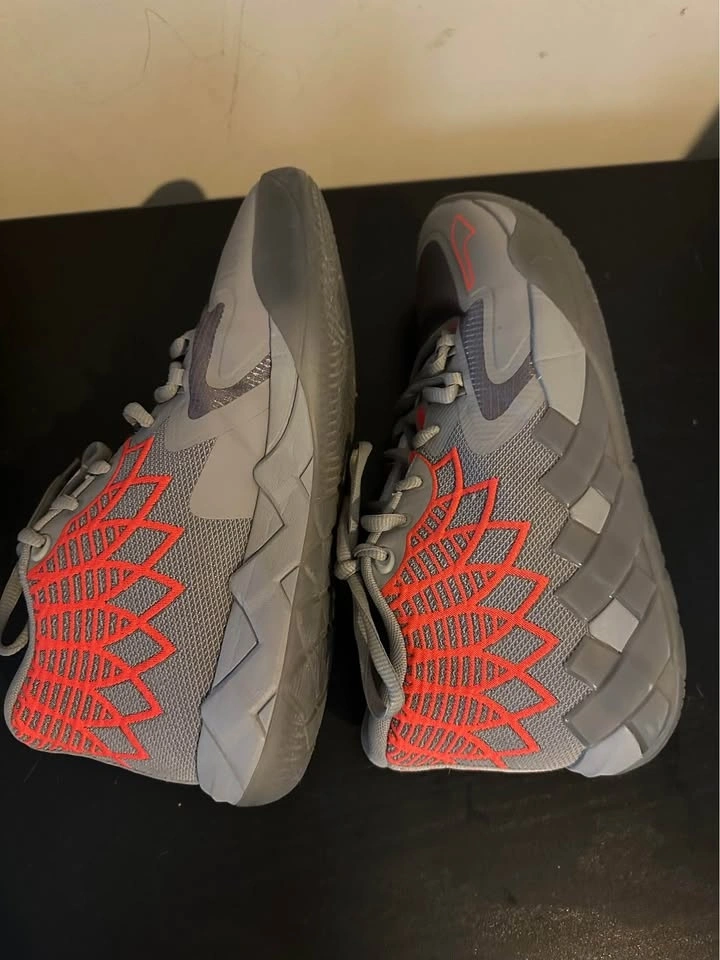 This is the first signature basketball shoe for NBA star LaMelo Ball. The "Rock Ridge" edition features a grey mesh upper with "Red Blast" accents and signature wing embroidery around the collar.