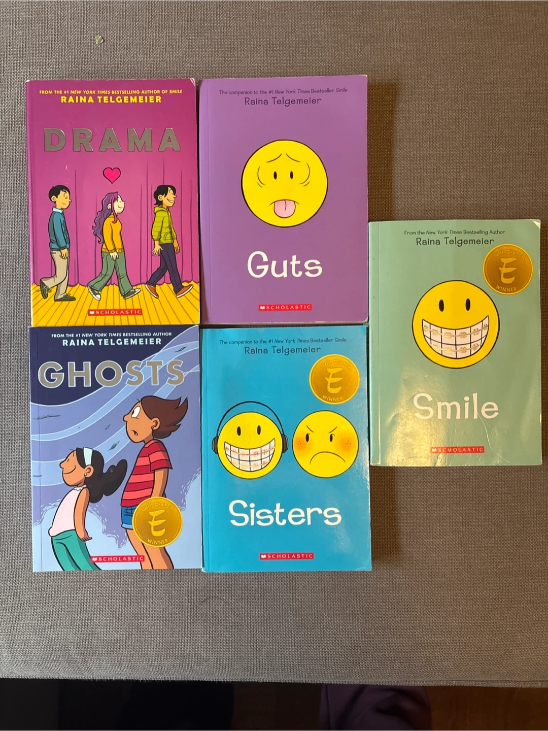 Set of five Raina Telgemeier graphic novels: Drama, Guts, Sisters, Ghosts, and Smile. These books are great for young readers exploring relatable themes. All books are softcover.