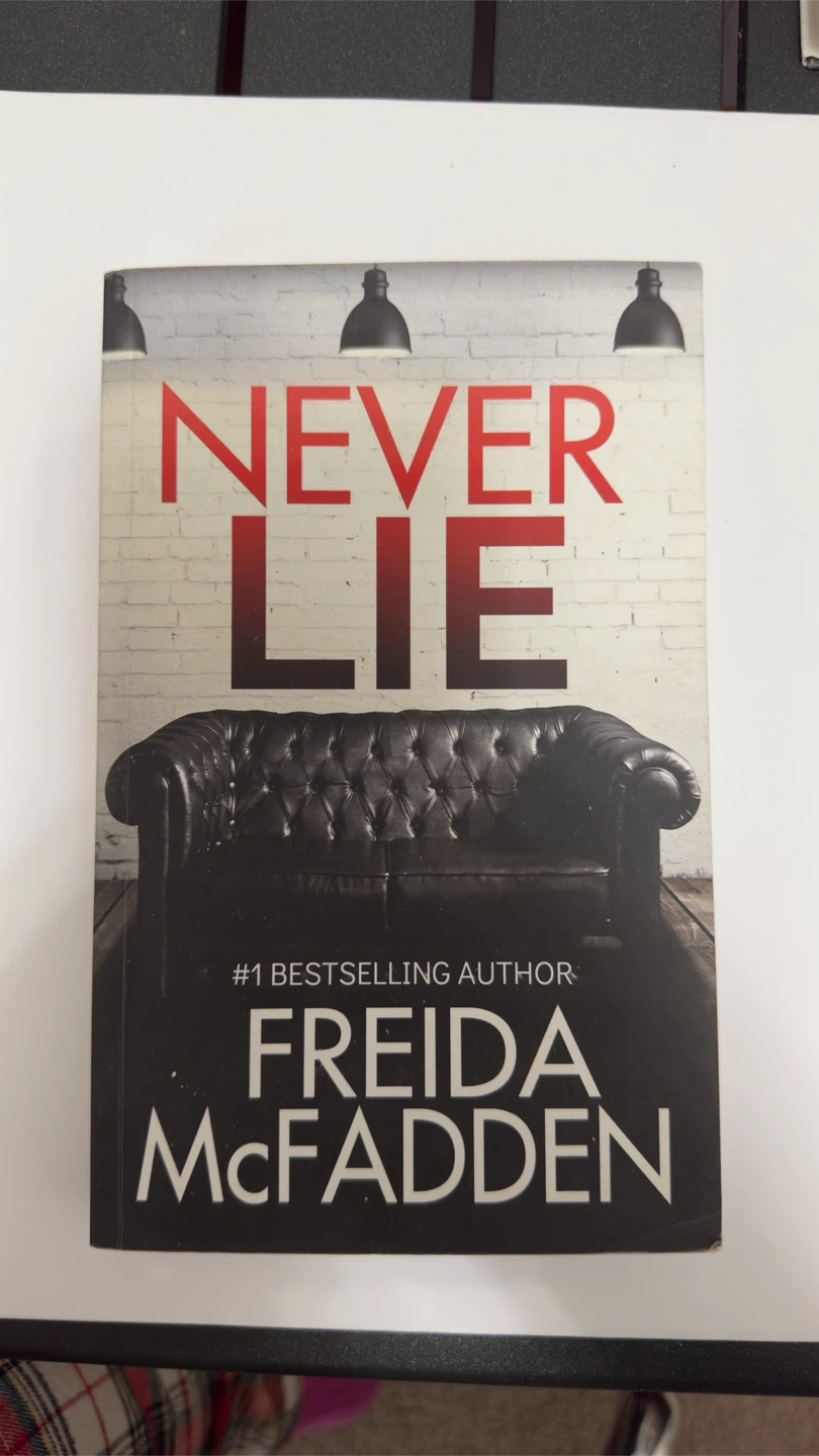 This is the paperback book "Never Lie" by Freida McFadden. It's a thriller novel about a newlywed couple who visit a remote manor. The book is by a #1 bestselling author.
