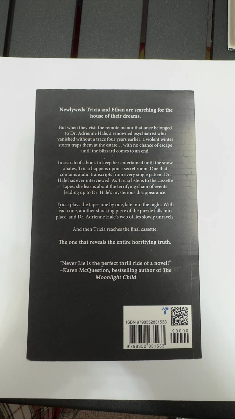 This is the paperback book "Never Lie" by Freida McFadden. It's a thriller novel about a newlywed couple who visit a remote manor. The book is by a #1 bestselling author.