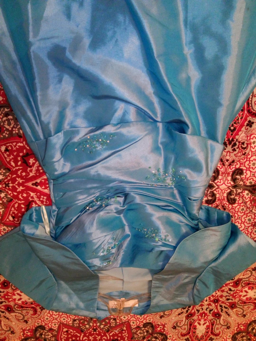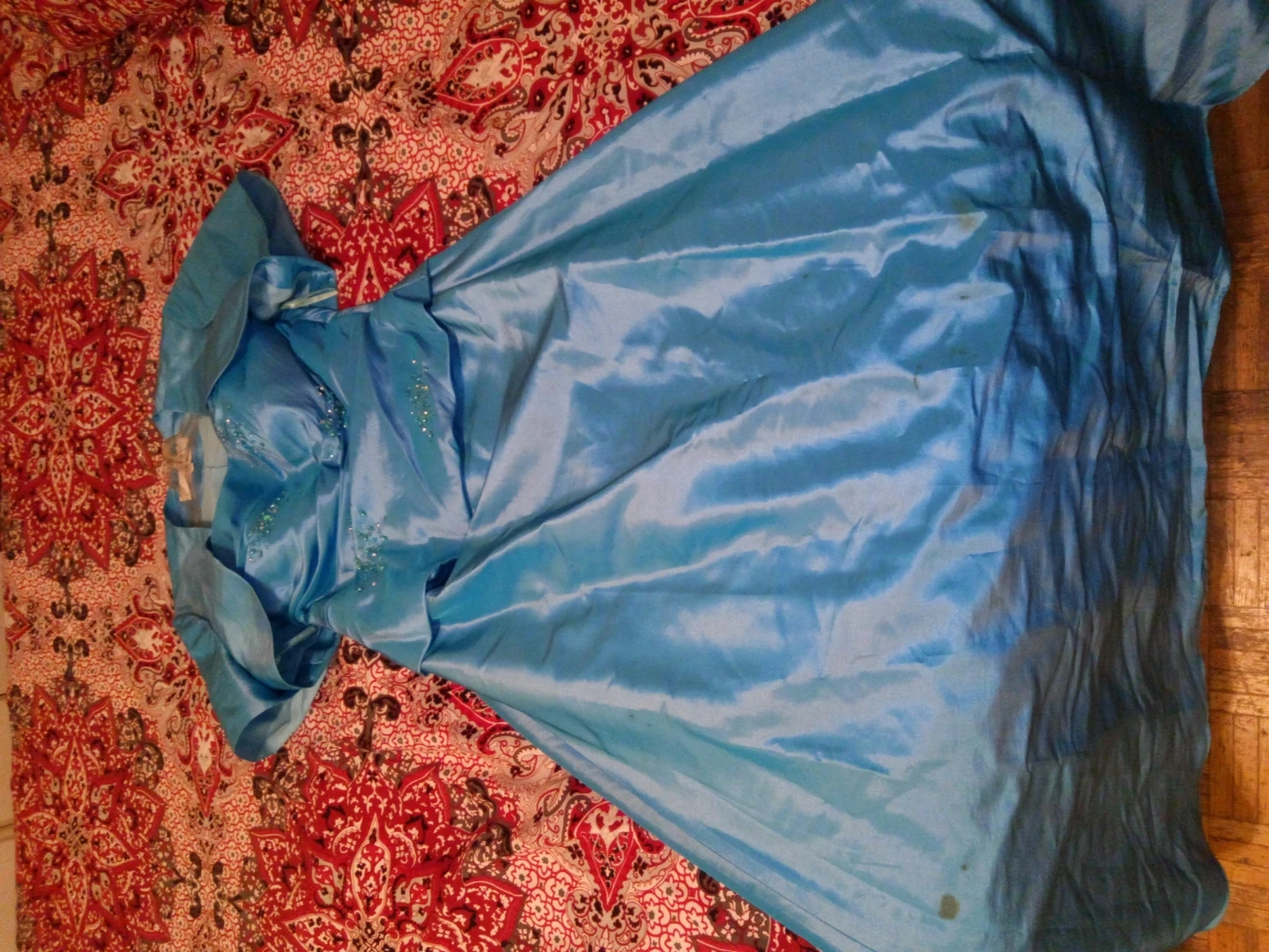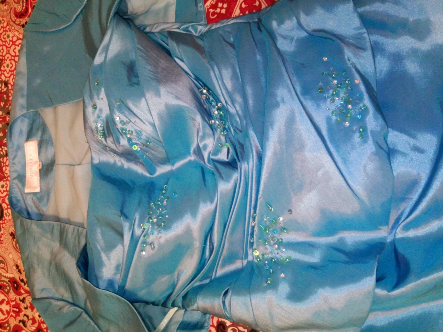 Beautiful blue evening gown with embellishments on the bodice. Satin material with a flowing skirt. This dress is perfect for formal events or a special occasion!