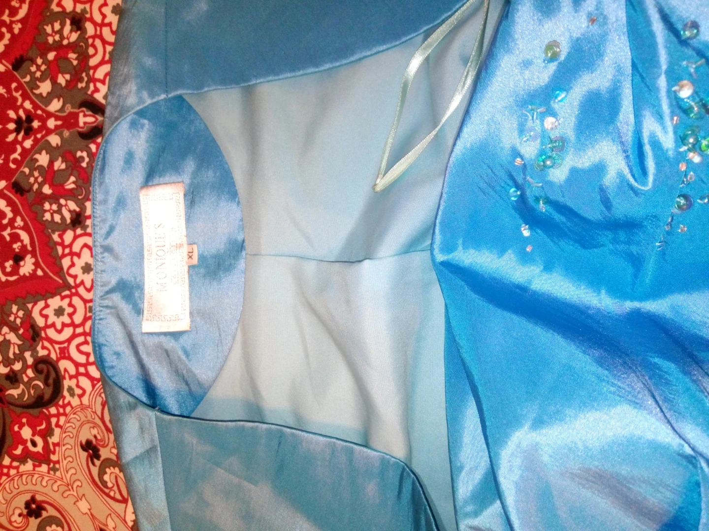 Beautiful blue evening gown with embellishments on the bodice. Satin material with a flowing skirt. This dress is perfect for formal events or a special occasion!