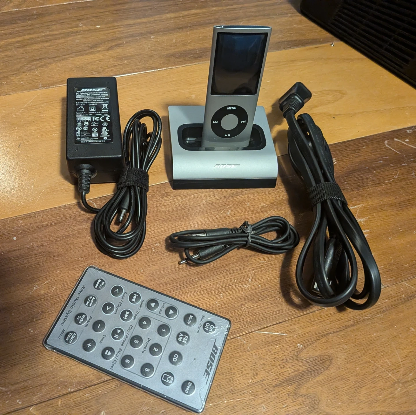 Docking station for iPods and iPhones with 30-pin connectors. Barely used, still has the original plastic cover on the remote. Comes with the iPod Nano 4th gen shown (the battery does not hold a charge so it's perfect for this)