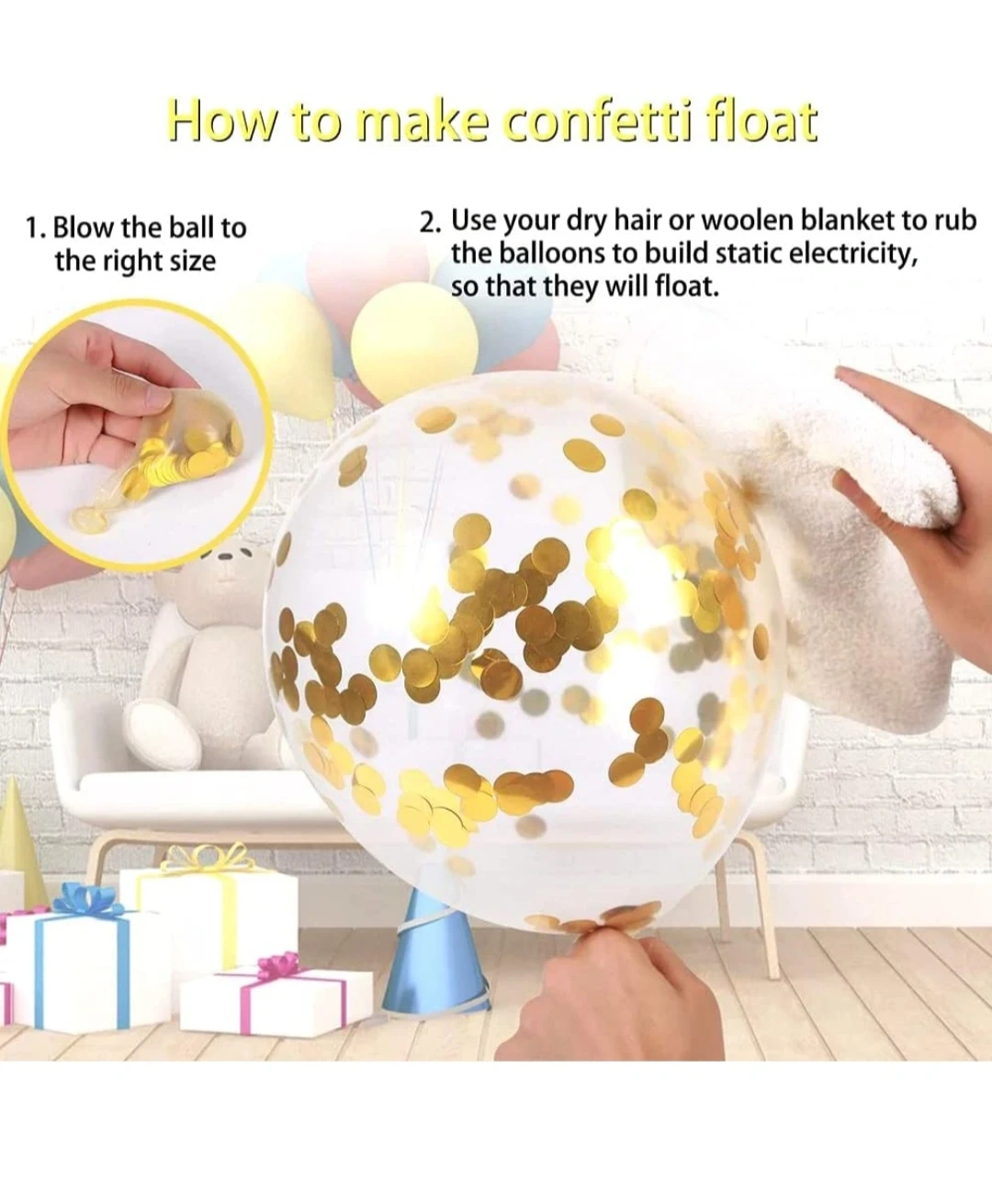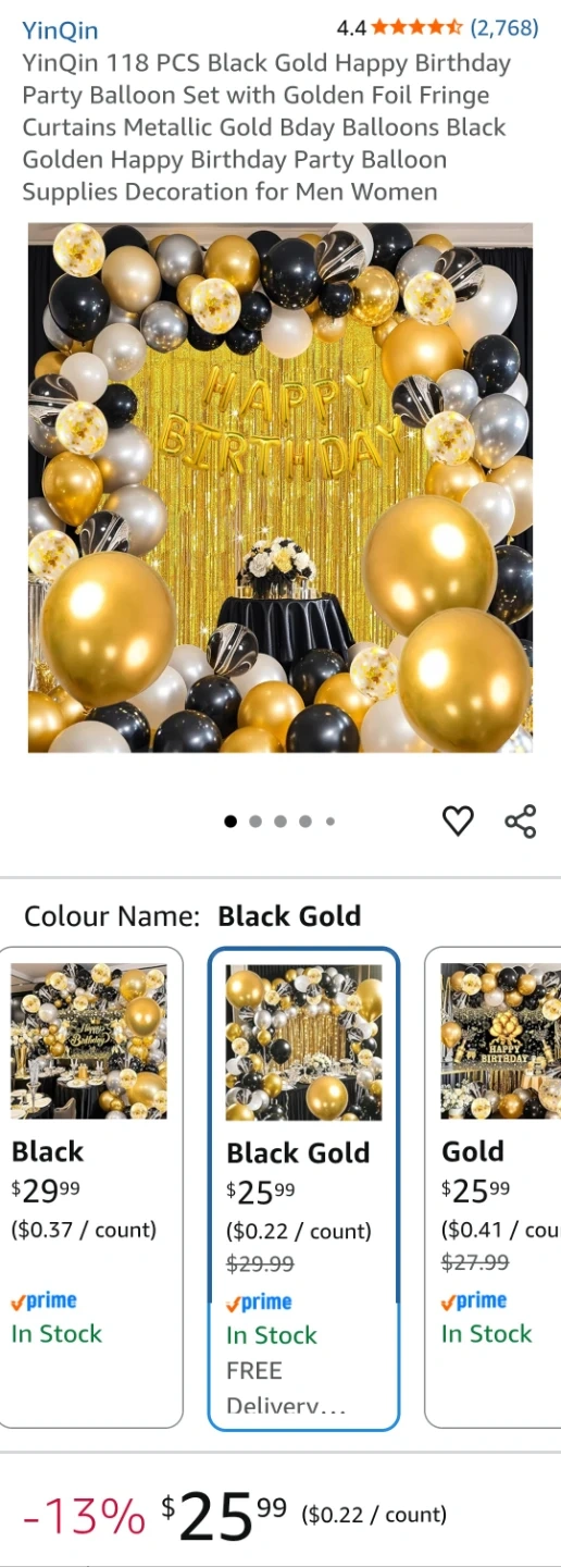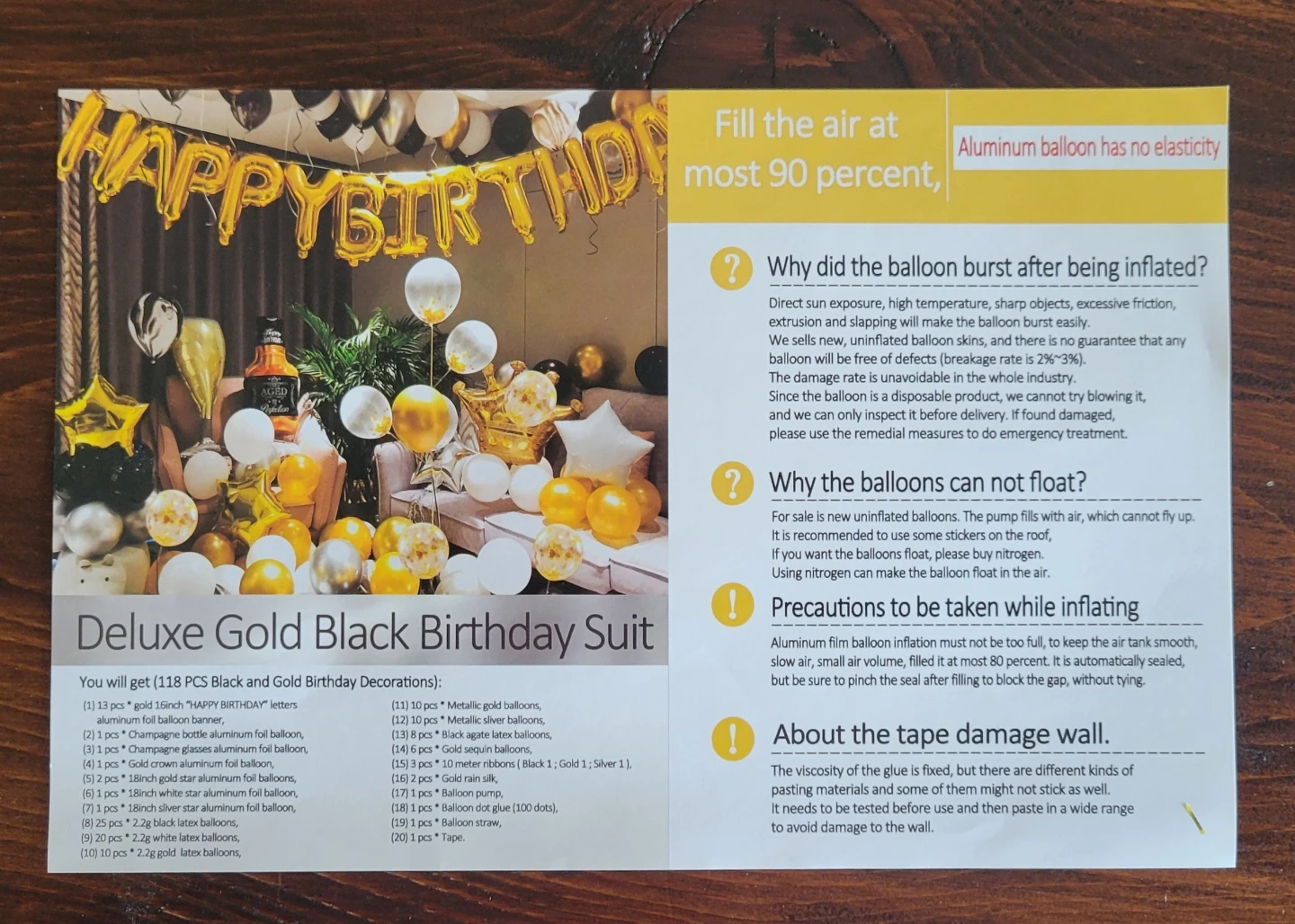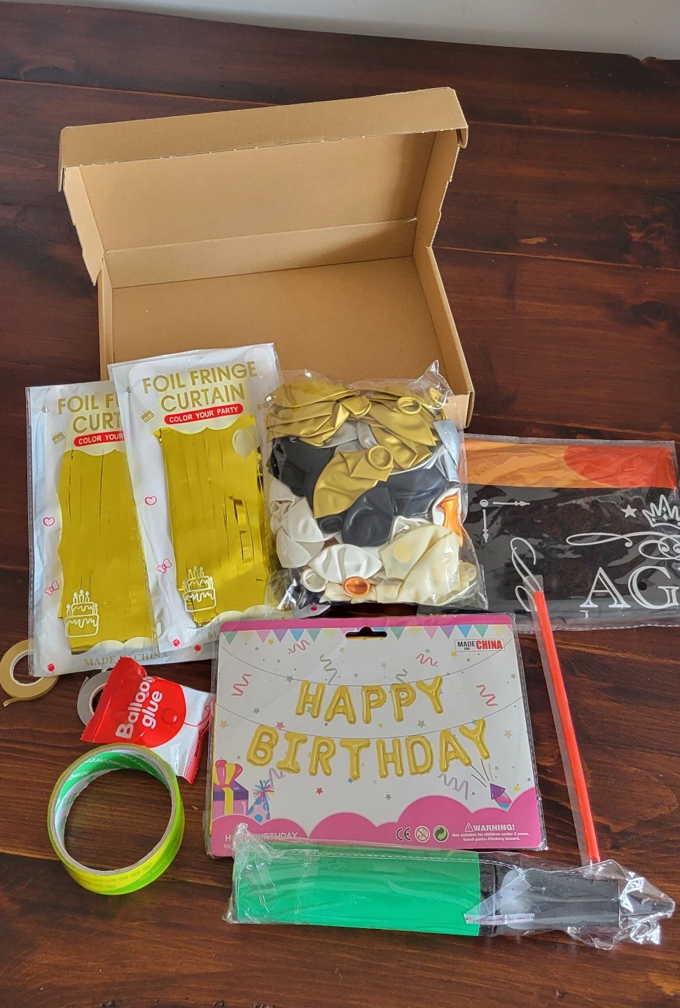This set includes 118 pieces for a festive birthday celebration. It features gold foil fringe curtains, metallic gold, black, and silver balloons. Also comes with a "Happy Birthday" foil banner, glue dots, and balloon tape.