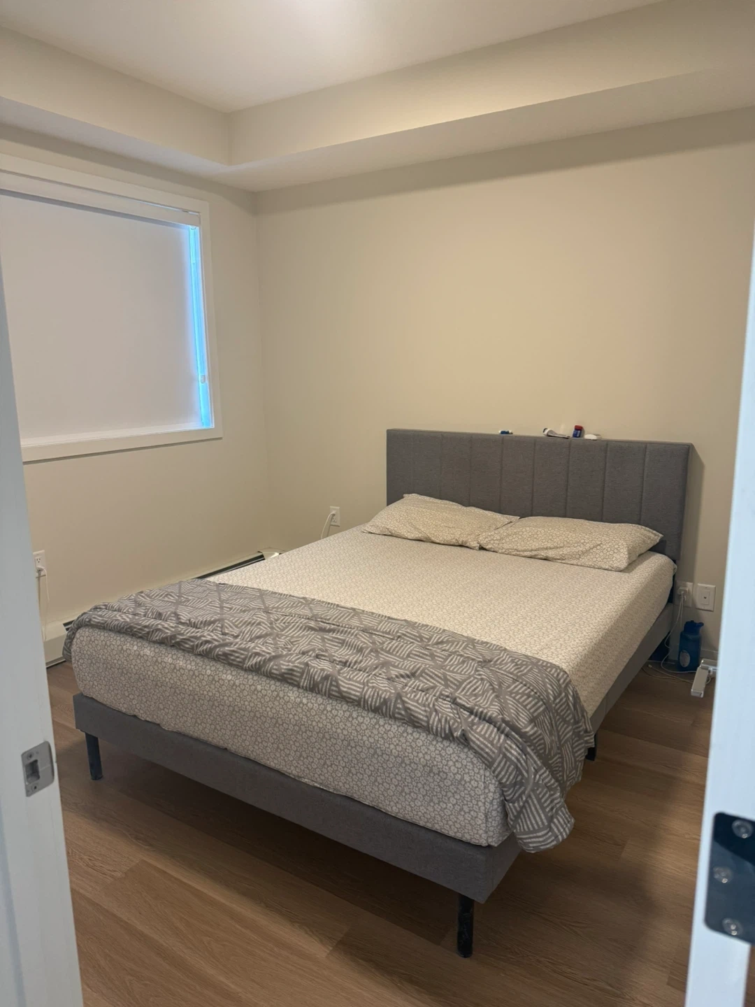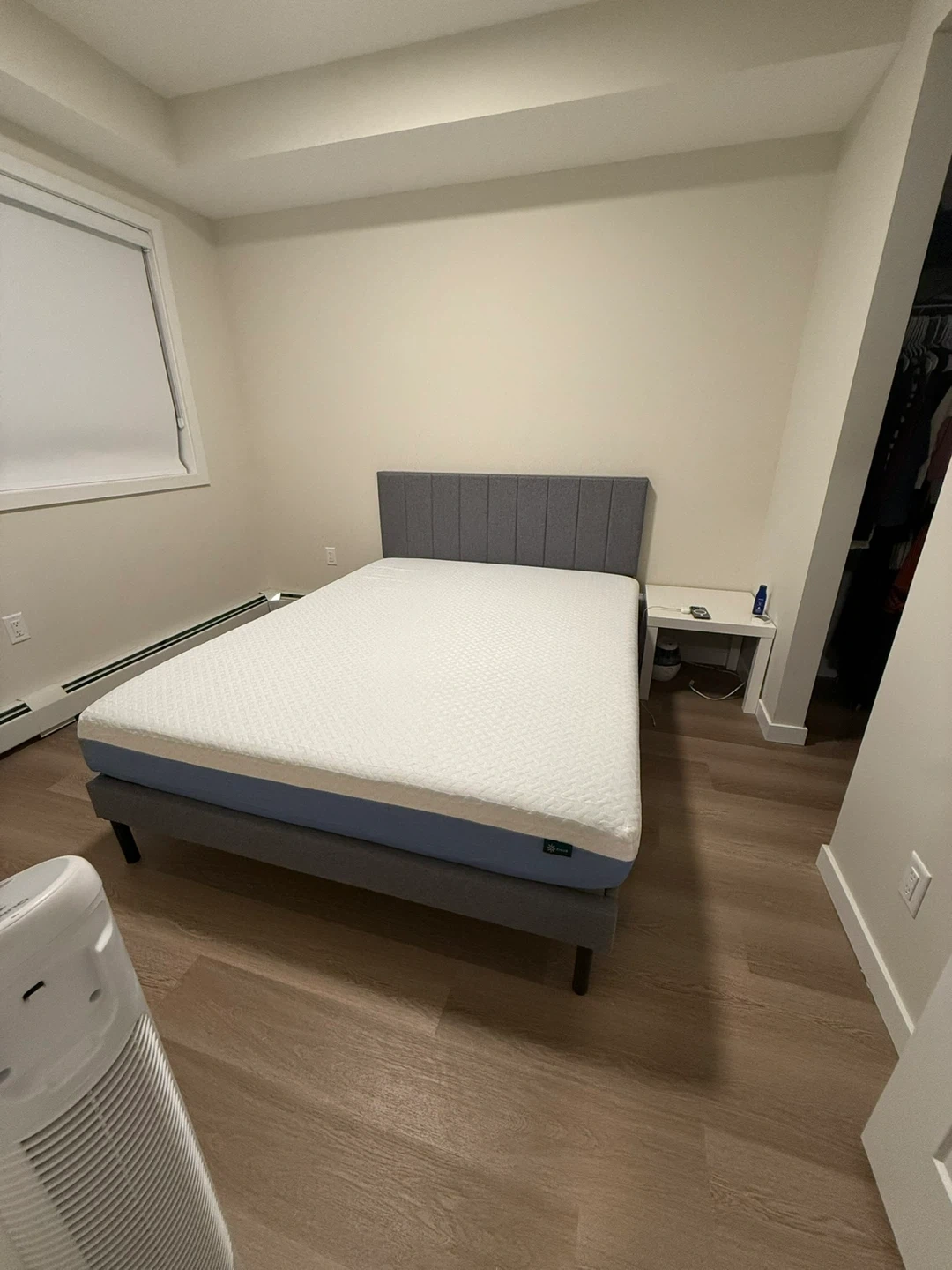 Modern platform bed frame with a grey upholstered headboard and footboard. This queen-sized frame comes with memory foam mattress. Easy to assemble.